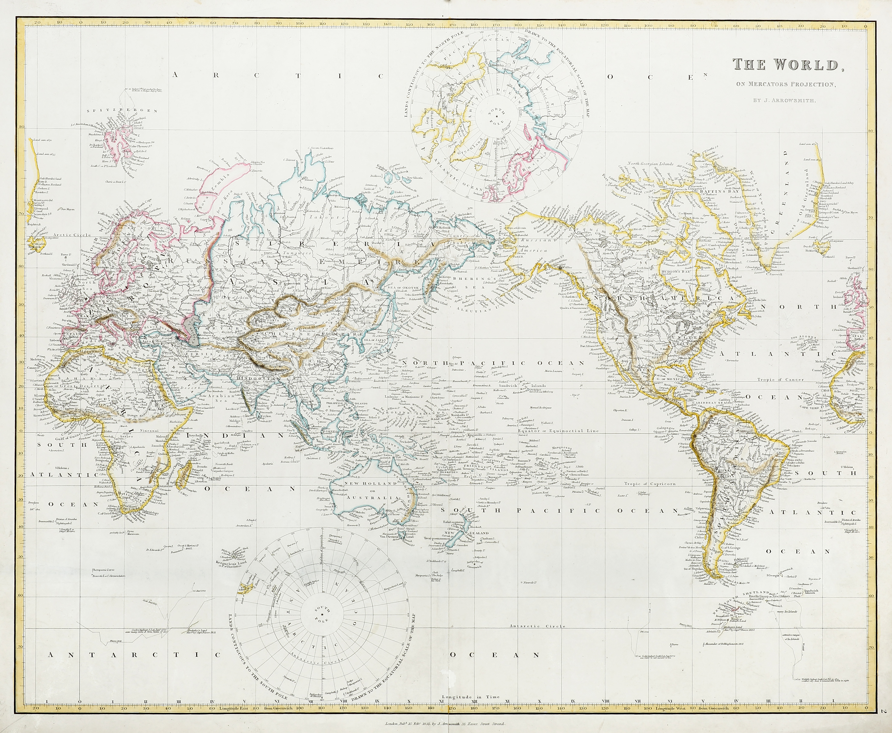Very detailed world map dated 15th February 1835, with insets of the north and south poles. The south pole with explorers tracks. Arrowsmith published the first edition of his great atlas in 1834, although he had intended to have completed … Read Full Description