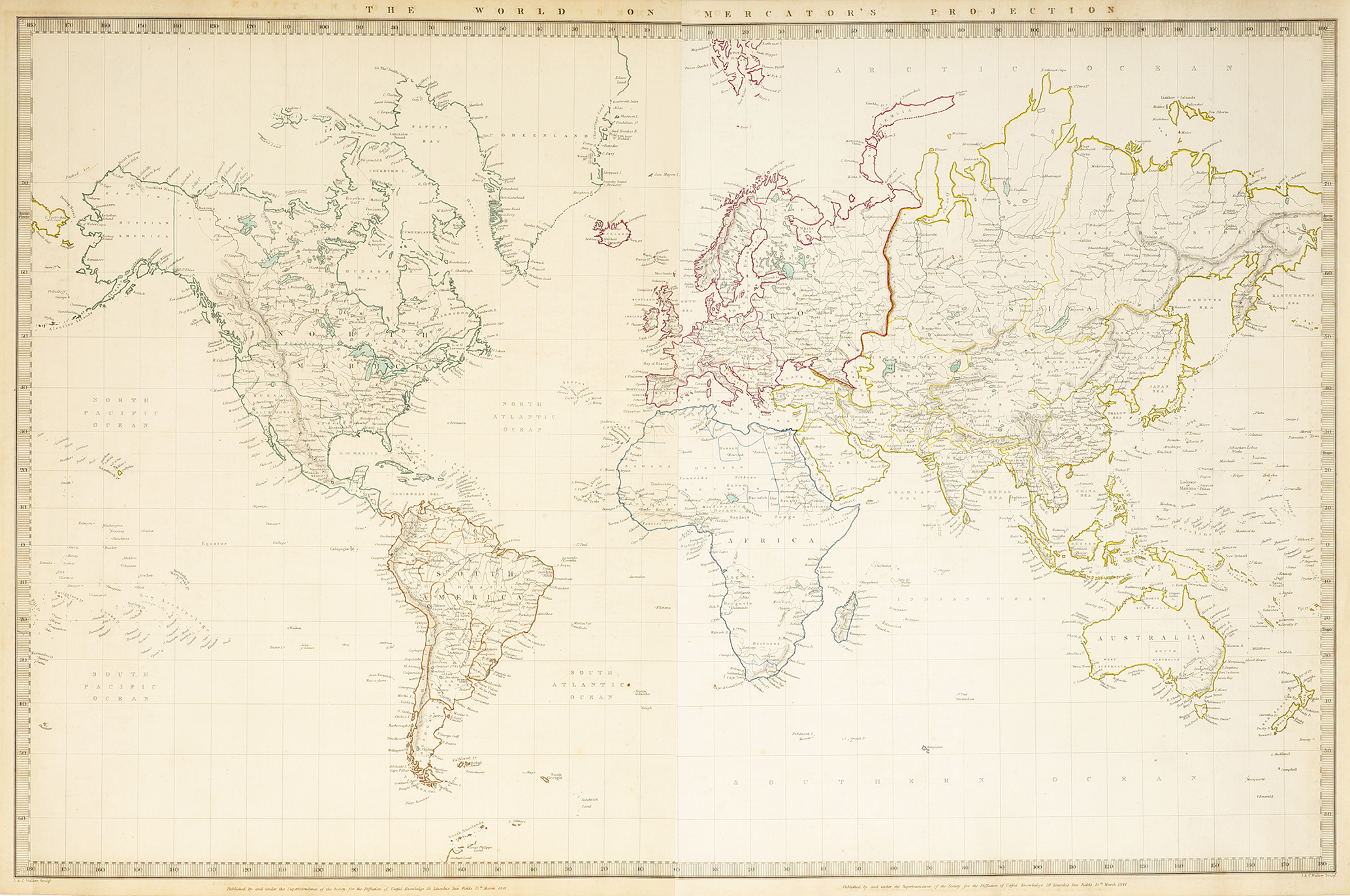 Very detailed hand coloured c.19th hand coloured engraved world map on Mercators Projection published by the Society for the Diffusion of Useful Knowledge.