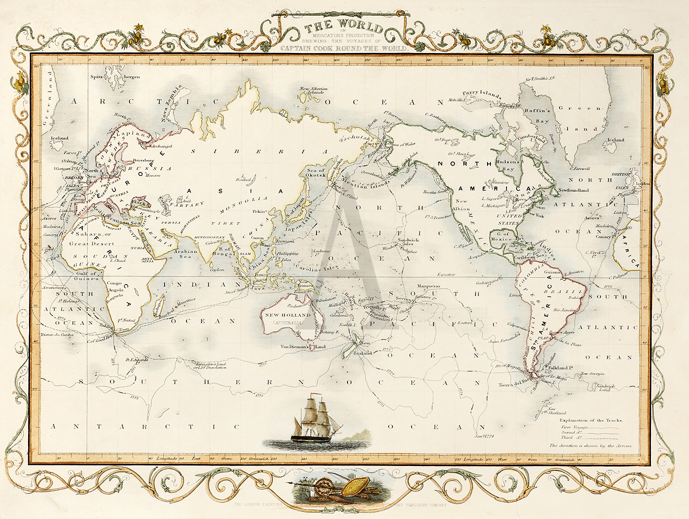 Very decorative c.19th world map on Mercator’s Projection with the tracks of James Cook’s three voyages and two vignette views; one of the a ship possibly, the Endeavour and the other of native implements.