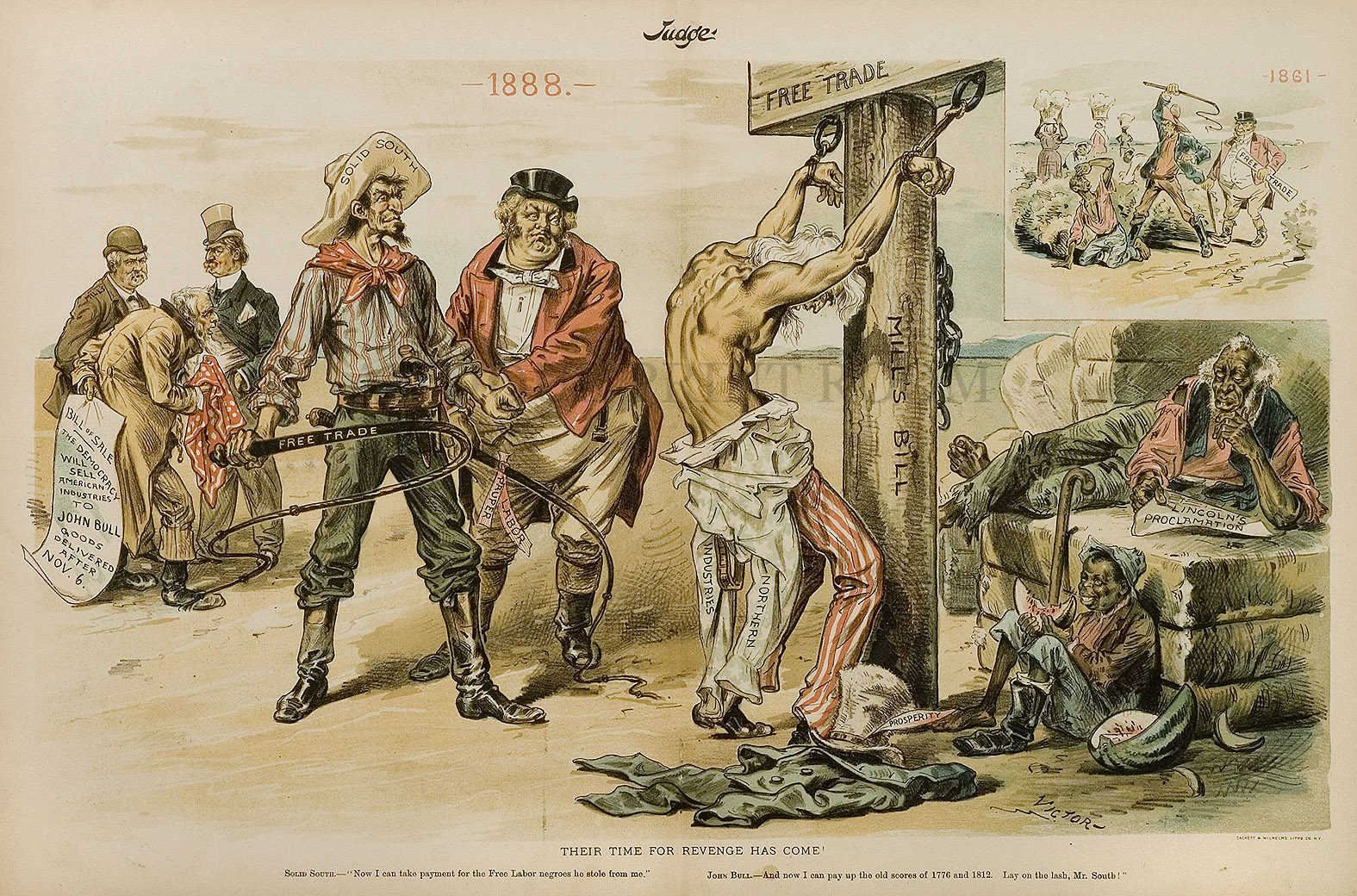 Political satirical colour lithograph from the original edition of Judge magazine.