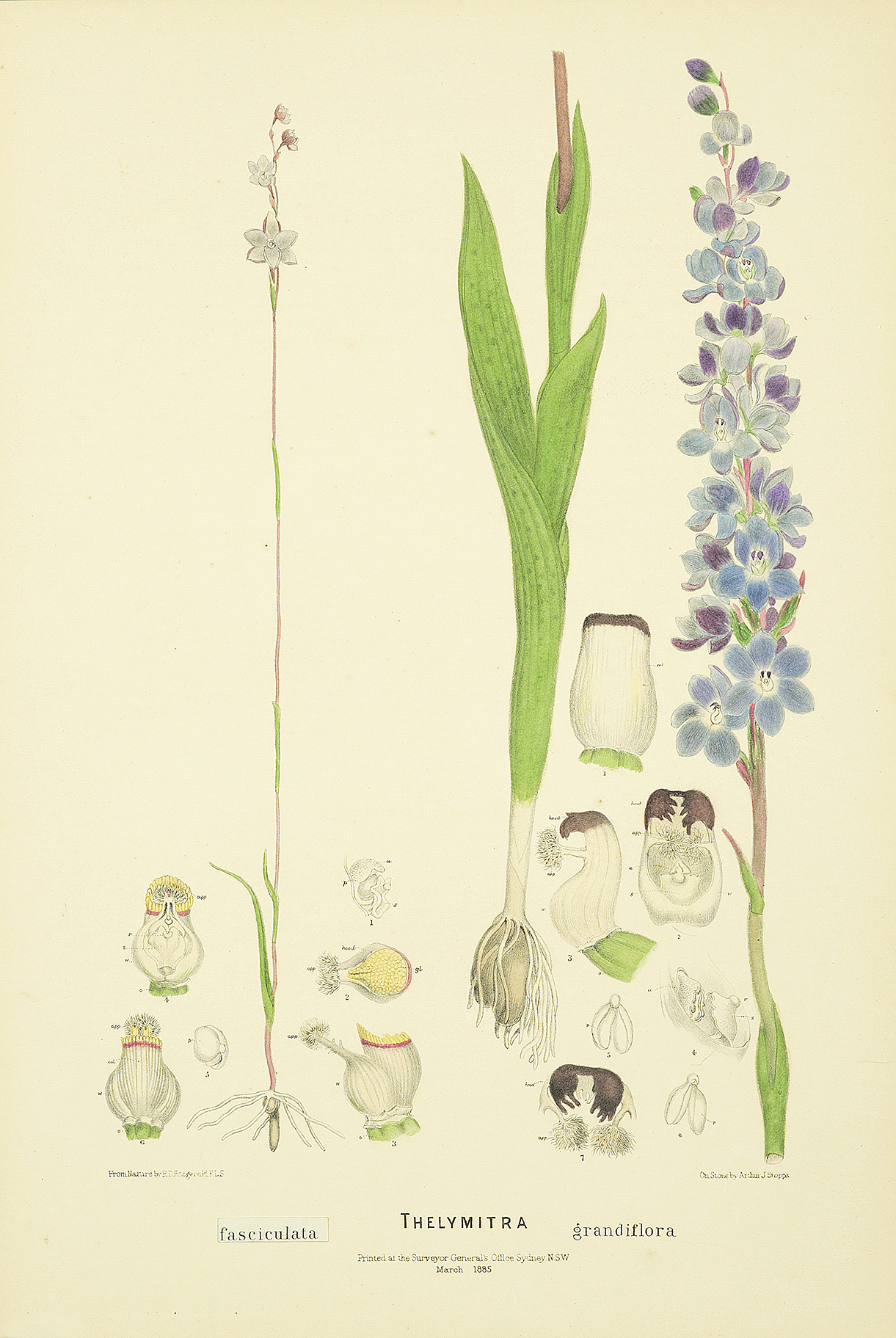 Robert Fitzgerald (1830-1902) Fitzgerald was a surveyor and naturalist, and arrived in Sydney from Ireland in 1856 and soon after was appointed to the Department of Lands as a draftsman for the crown. In his own time Fitzgerald pursued his interest in botany and in 1864 travelled to Wallis Lake, north of Newcastle in New South Wales to collect ferns and orchids which he intended to cultivate around his Hunter's Hill home. This interest in orchids was maintained throughout his life and in 1869, 1871 and 1876 he visited Lord Howe Island to collect further botanical samples. It was during this time that he discovered Dracophyllum fitzgeraldii F. Muell, which was later to be named in his honour. He worked for the Department of Lands and was an enthusiastic field collector, devoting himself especially to the native orchids. The publication of the 'Australian Orchids' was acclaimed throughout the botanical world. J.D. Hooker considered it 'a work which would bring honour to any country and to any botanist', while George Bentham wrote 'thanks to you the Australian Orchidaceae are now better known than those of any country out of Europe'.