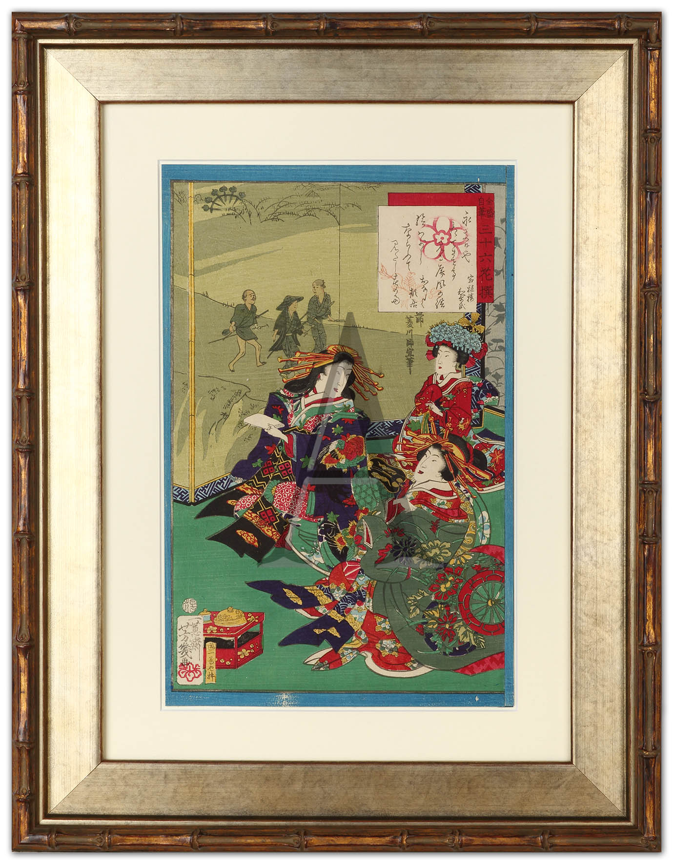 Yoshiiku was a famous wood block artist of beautiful women, actors and warriors.His father ran a teahouse and after showing promise he was apprenticed to Utagawa Kuniyoshi (1798-1861). Also working in the same studio was Yoshitoshi Tsukioka.In the late 1860s, Yoshiiku and Yoshitoshi collaborated on as series titled; Eimei nijuhasshuku series.