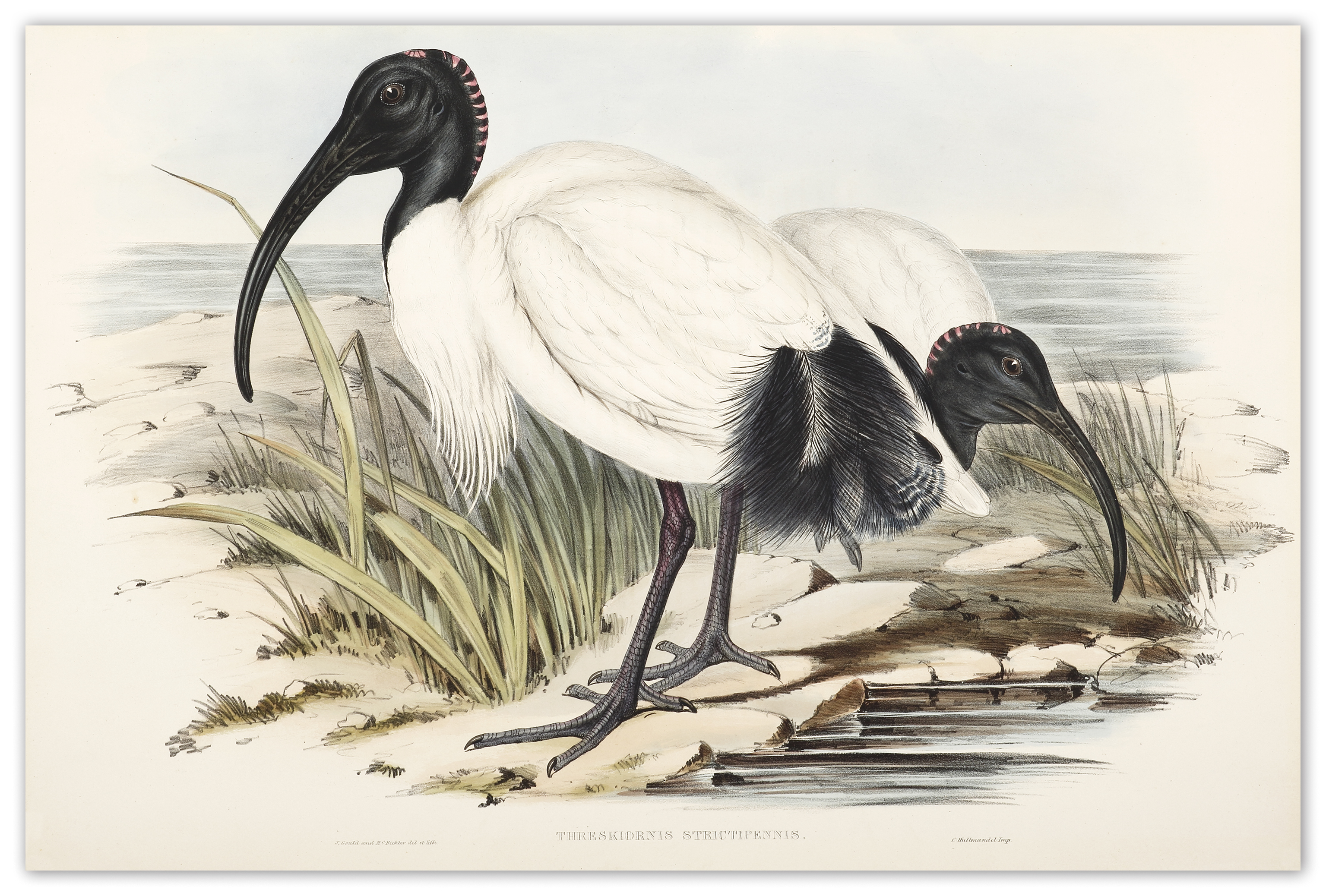 Rare lithograph of the best and largest colonial image of the Australian White Ibis by John Gould from his epic series, The Birds of Australia and Adjacent Islands, published for the author, printed by Richard and John E. Taylor, London.