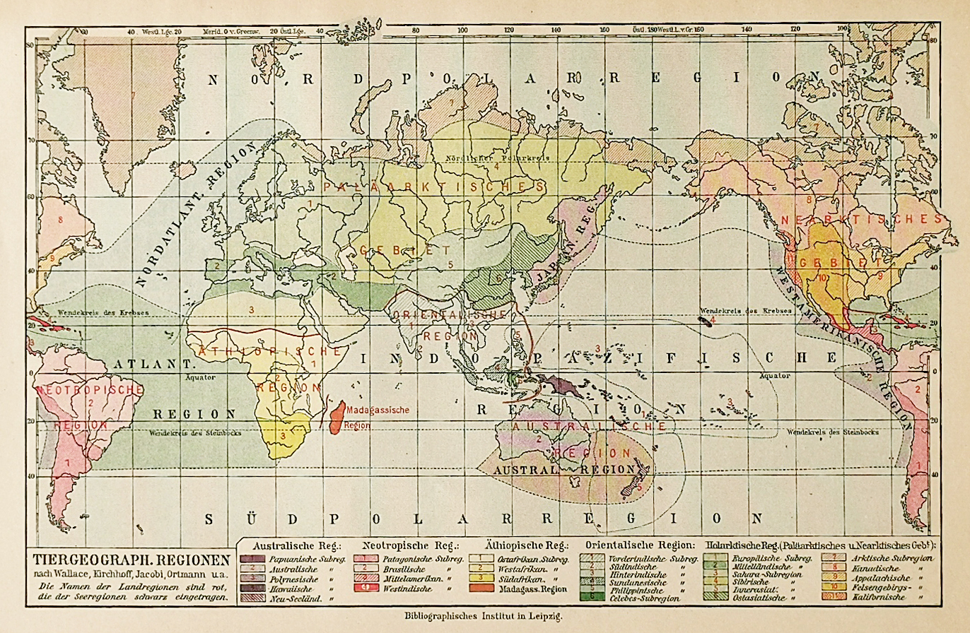 Detailed world map showing zoological distribution. Colour ket at lower left.