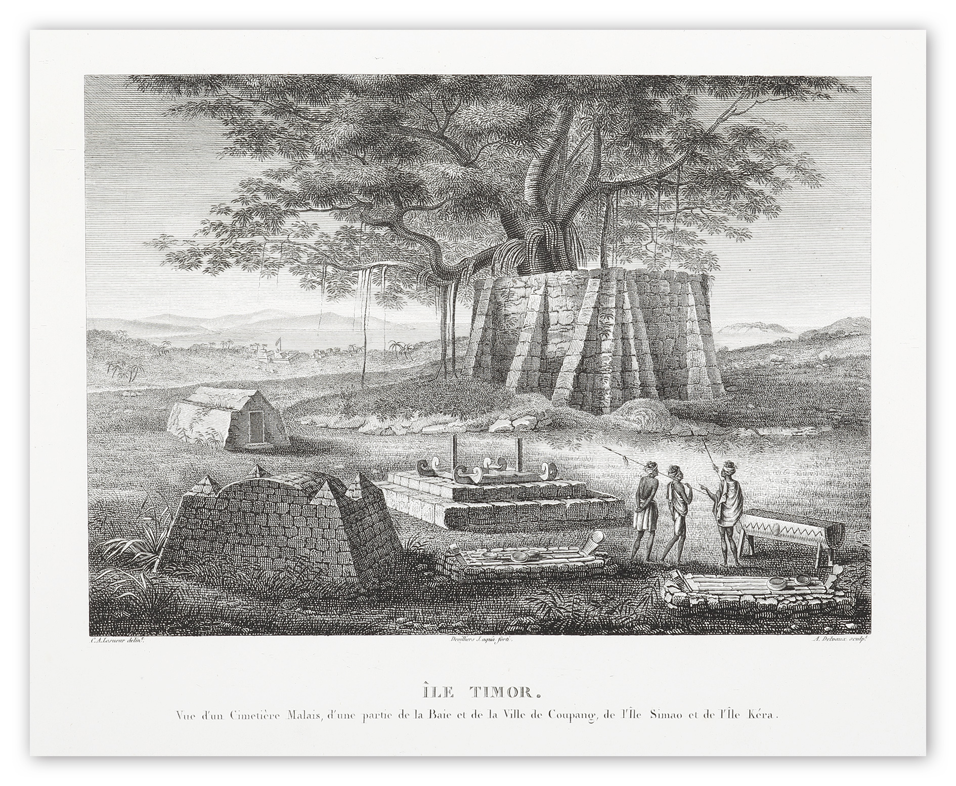 arce engraving of the Chinese cemetery at Coupang, from the important ill fated French voyage of discovery under Nicholas Baudin. The view is at Coupang, present day Kupang which was an important trading port and was used as a resupply point for many other important voyages in the region, including those of Flinders and Freycinet’s Uranie voyage. Lesueur was employed to illustrate the account of Baudin’s voyage.