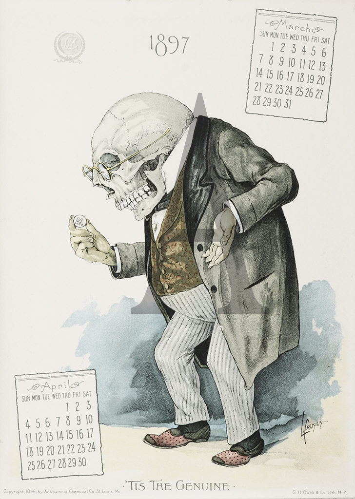 The company’s name, Antikamnia, means “opposed to pain” and its Antikamnia tablets were a patent medicine that reduced fever and relieved pain. Like Dr. Crusius, the company’s founders were graduates of the St. Louis College of Pharmacy. The calendars were a limited edition sent to doctors upon request. Many of The Antikamnia Calendars appeared after his untimely death in St. Louis on January 2, 1898.