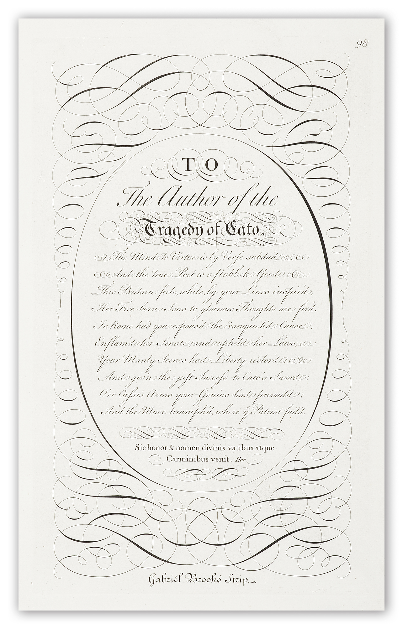 Appearing in Bickham’s Universal Penman was this poem by writing master Samuel Vaux, dated 1734, conveying, that poor writing was a disgrace to the beauty of the writer: “An artless Scrawl ye blushing Scribler shames; All shou’d be fair that Beauteous Woman frames.” And then this piece, hinting, that calligraphy may have a role in encouraging romance: “Strive to excel, with Ease the Pen will move; And pretty line add Charms to infant Love.” (Monaghan, 2005, p. 281).