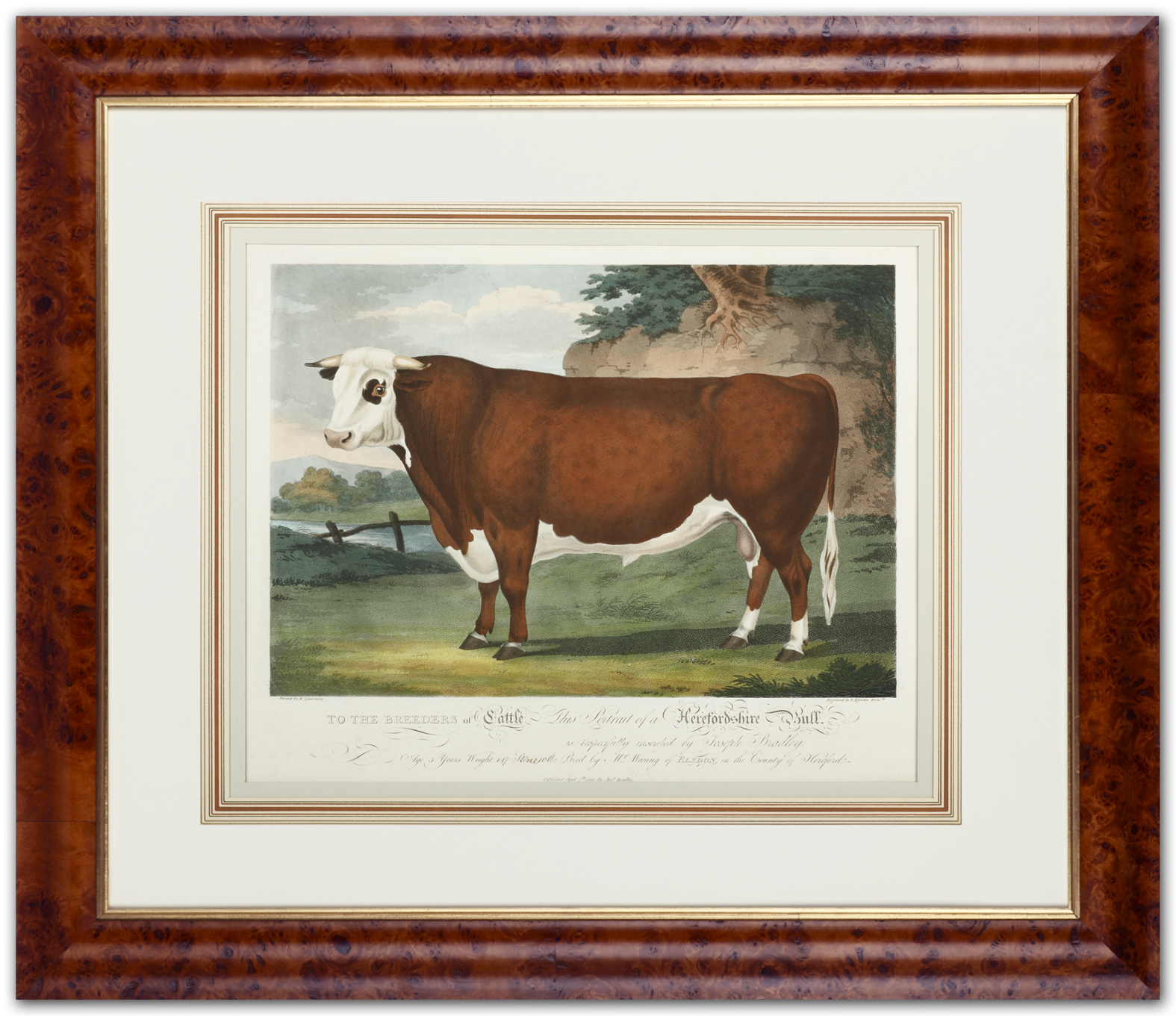 1806 EARLY HEREFORD CATTLE PORTRAIT A very early portrait of a Hereford bull. Benjamin Tomkins is credited with being a primary founder of the Hereford breed, beginning in 1742 with a bull calf from the cow Silver and two cows, Pidgeon and Mottle, inherited from his father’s estate. In 1795 a sale of Herefords belonging to John Galliers, Wigmore Grange was made where the prices and buyers’ names were recorded, being the first ever documented sale of the breed. The first Herefords were exported to Australia in 1817. Mackenzie, Ian British Prints 1987 Pg 113 Mitchell, Sally Dictionary of Equestrian Artists 1985 pg 299