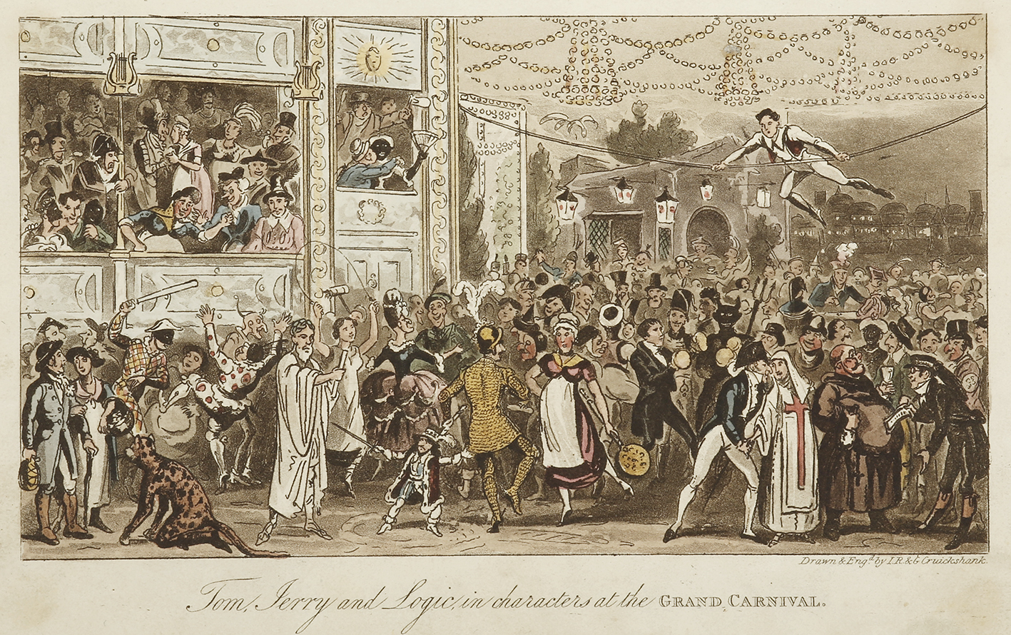 Early C19th comical aquatint of a carnival with tight rope walker of Corinthian Tom’s and Jerry Hawthorn’s adventures in metropolitan London in the 1820’s.