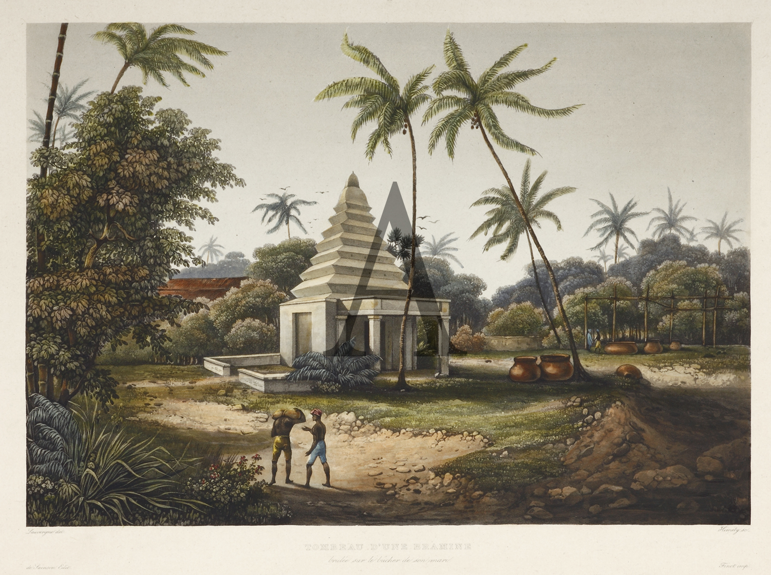 Rare lithograph of Bramin tombs, India from the official accounts voyage of La Favourite under the command of the French navigator Cyrille Pierre Théodore Laplace (1793-1875) on his circumnavigation of the globe.