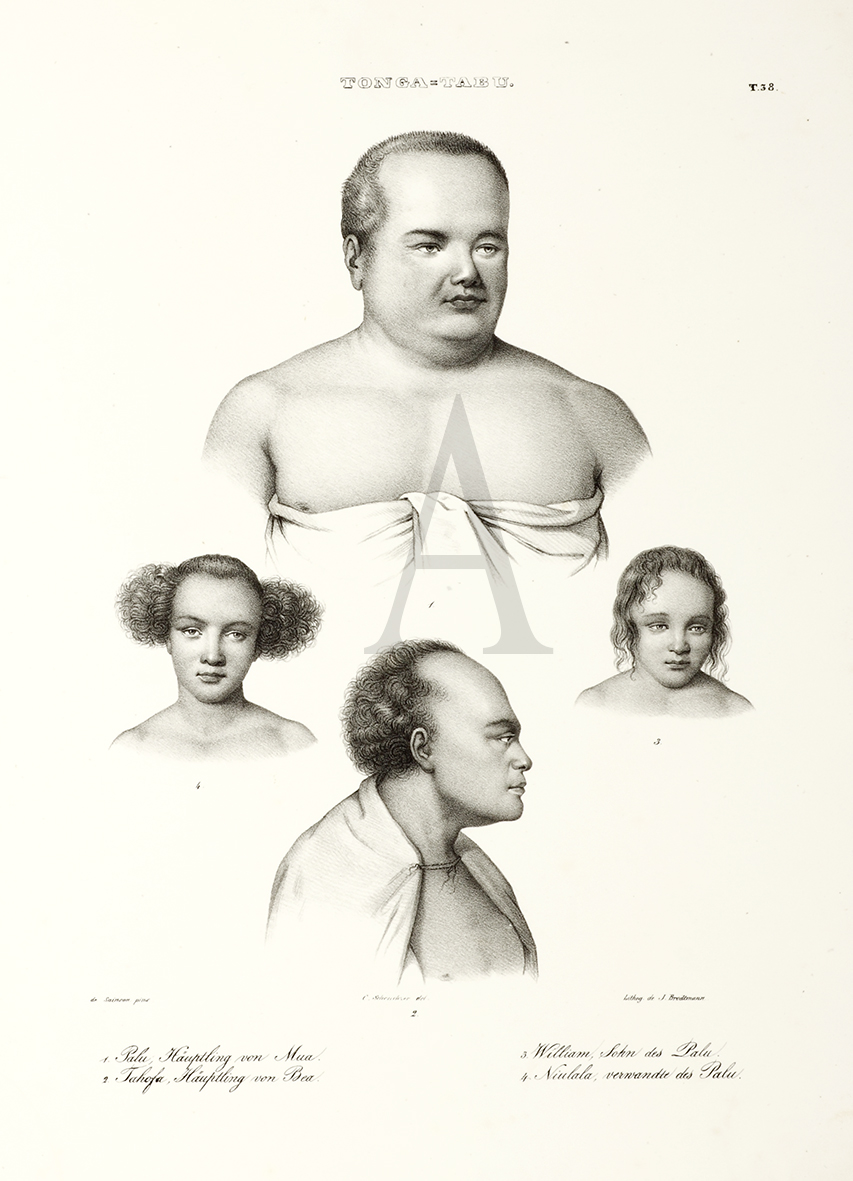 Scarce c.19th lithograph of Tongan natives by Louis Auguste de Sainson (1800-1887. From: D’Urvile D, J. Entdeckungs-Reise der franzosischen Corvette Astrolabe unternommen auf Befehl Konig Karls X in den Jahren 1826-1827-1828-1829 ( Voyage of discovery of the French corvette Astrolabe undertaken by … Read Full Description