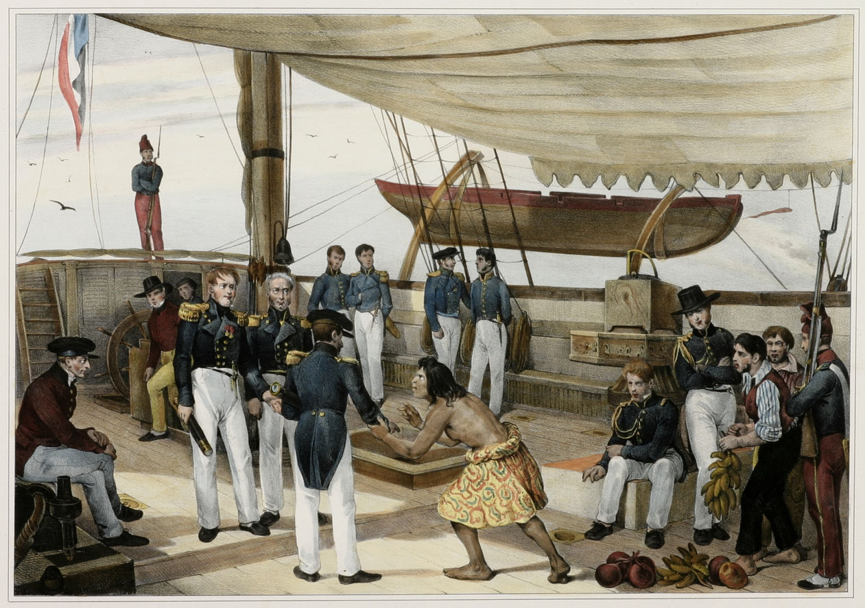 French artist on the voyage of exploration on board the Astrolabe under the command of Dumont D’Urville which explored and visited the Pacific, Asia, New Zealand and Australia. He began his naval career at the port of Rochefort, working there from 21 August 1825 until 6 January 1826, where he joined the Astrolabe as a draughtsman. The Astrolabe visited Australia from October to December 1826 and De Sainson made a number of drawings of King George Sound (WA), Westernport VIC), and Jervis Bay NSW and Sydney). On the Astrolable’s return to Australian waters during December 1827 to early January 1828 the Astrolabe anchored at Hobart Town where de Sainson made a number of important drawings of Hobart and its environs. On his return to France de Sainson was part of the editorial group that made the official account Historical Atlas of the expedition ready or publication. In November 1829, at Dumont d’Urville’s request, de Sainson was promoted commis de marine 3e classe. He became a Chevalier de la Légion d’Honneurin August 1831 and a commis de 2e classe in September 1833. Further biographical information is not available after this time.