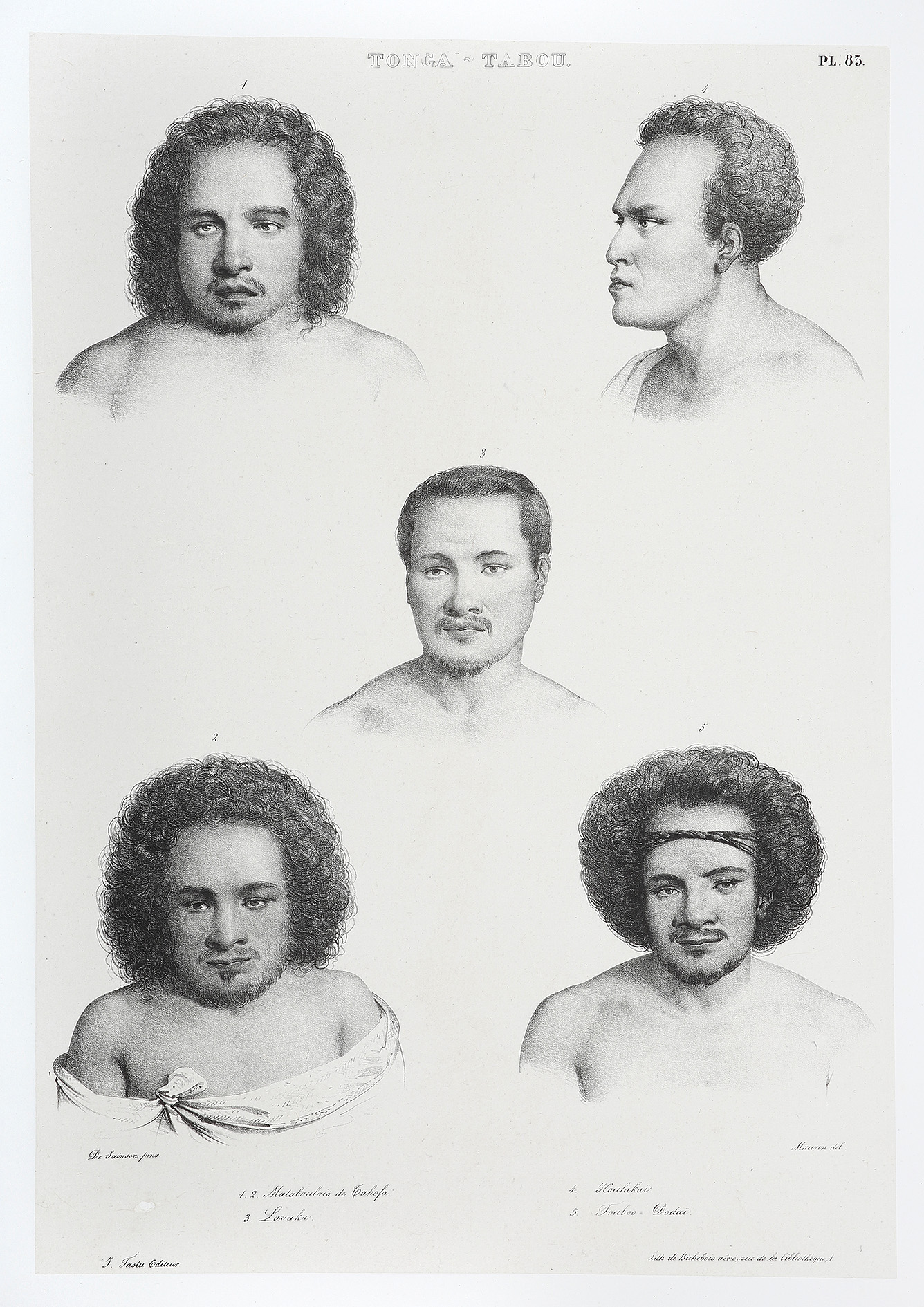 Tonga-Tabu.  1.2. Mataboulais des Tahopa. 3. Lavaku. 4. Houlakai. 5. Touboo-Dodai. - Antique Print from 1833
