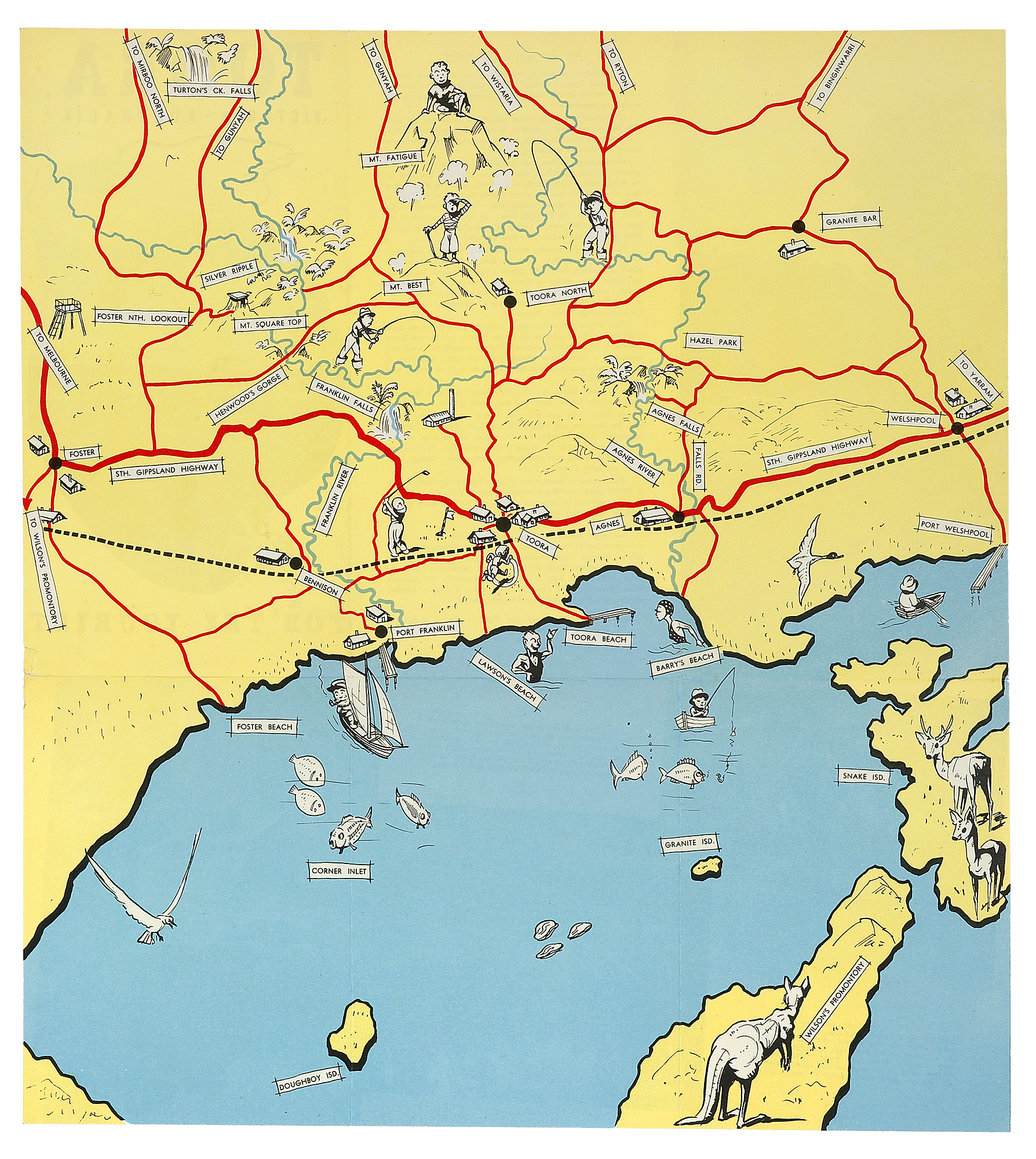 Tourist map of the Toora district of Victoria by Henry John Weston (1874-1955) for the Betterment and Publicity Board of Victoria. Covers Corner Inlet, Gippsland.