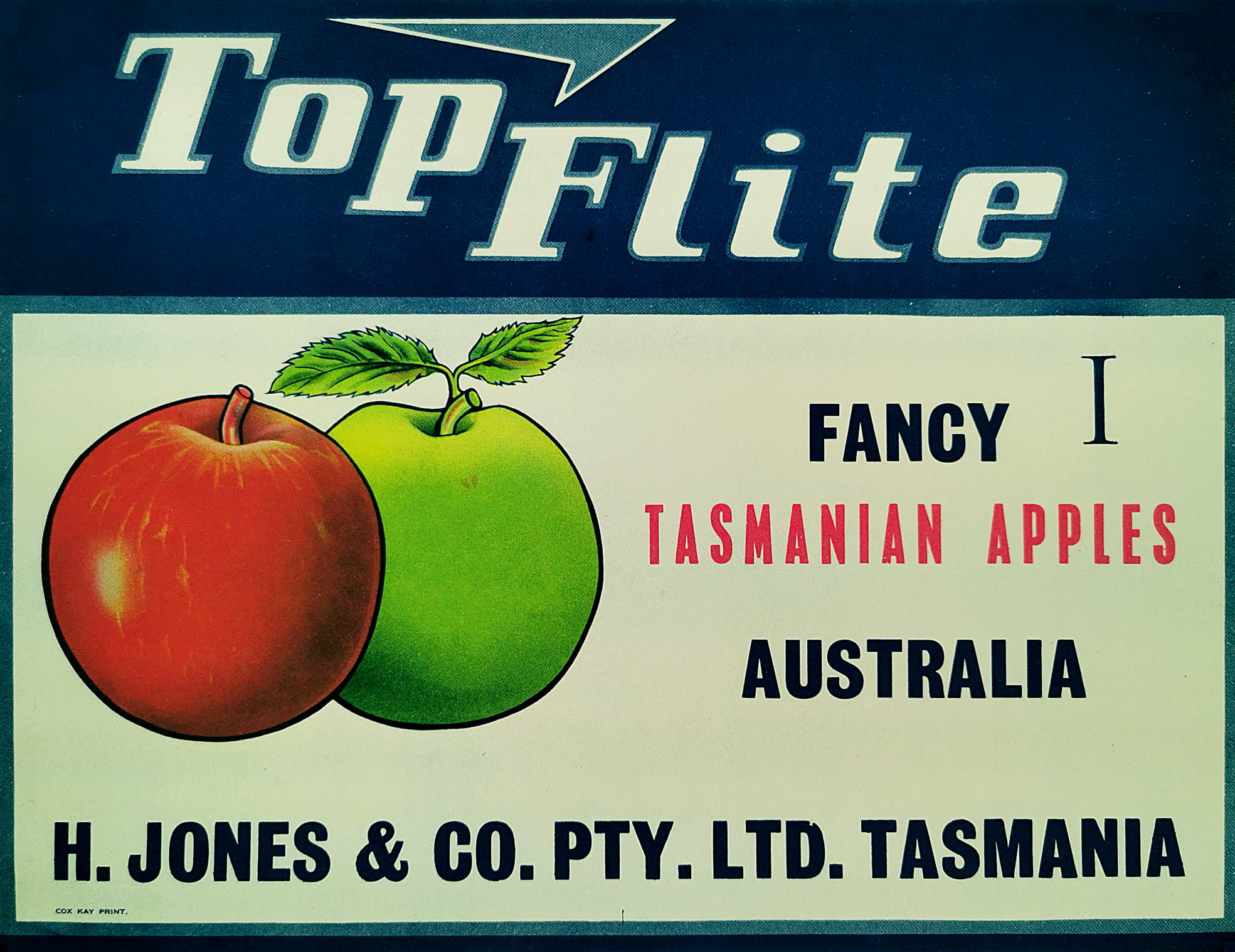 Original Australian 1950’s fruit crate label used for Top Flite, Fancy Apples, Tasmania.