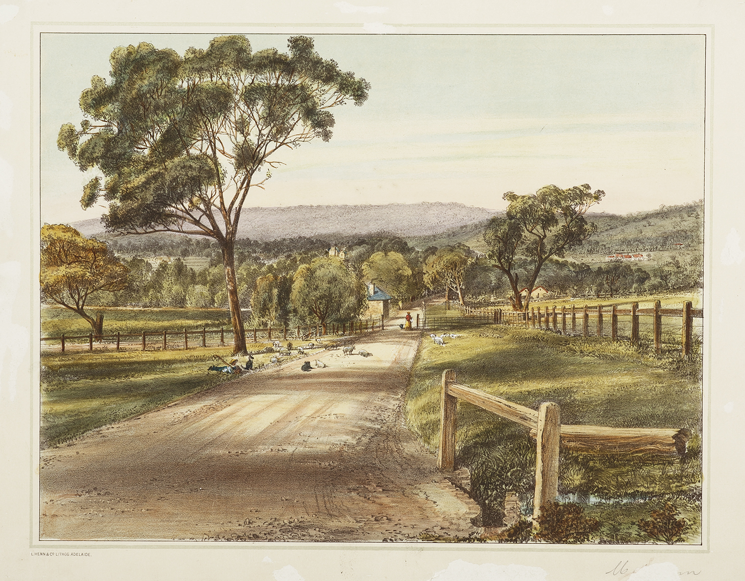 Rare colonial lithographed view of Mitcham and Torrens Park showing the estate of Sir Robert Torrens, (1814-1854) which can be seen at centre left. Torrens built a large home which he called “Torrens Park” in 1853–4. In 1865 Torrens sold … Read Full Description
