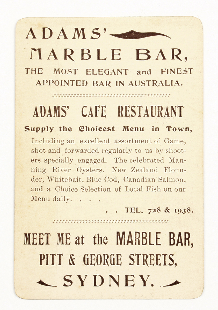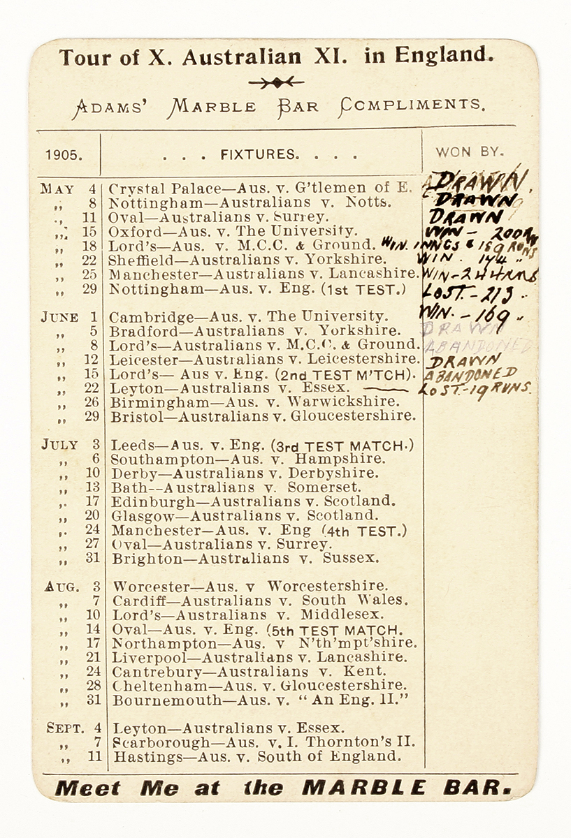 Rare 1905 fixtures card for the Australian cricket tour in England. Manuscript scores noted for May and June. Advert for the famous Adam’s Marble Bar which was on the site of the present day Hilton Hotel, George street, Sydney.