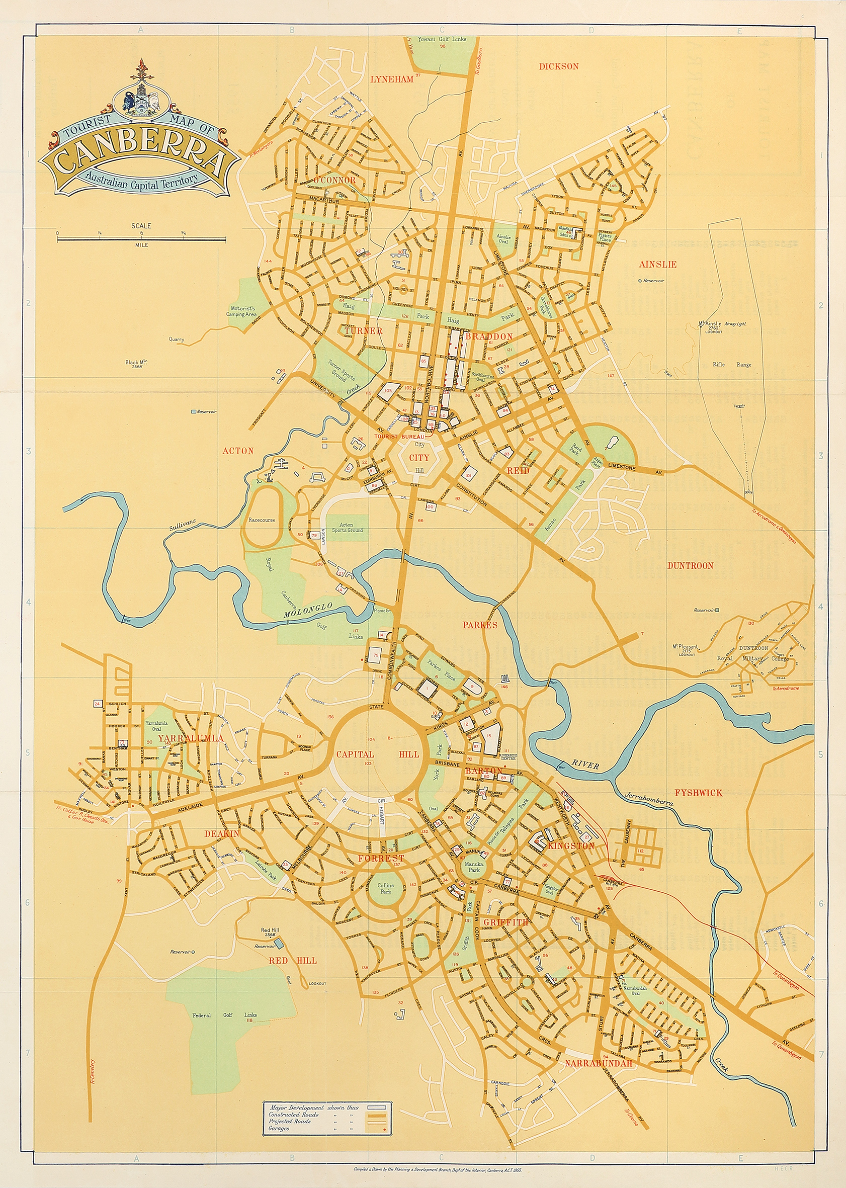 Scarce, large scale c.20th map of Canberra made by the Department of the Interior which at the time was headed by John Rogers (1898-1971), surveyor and public servant.