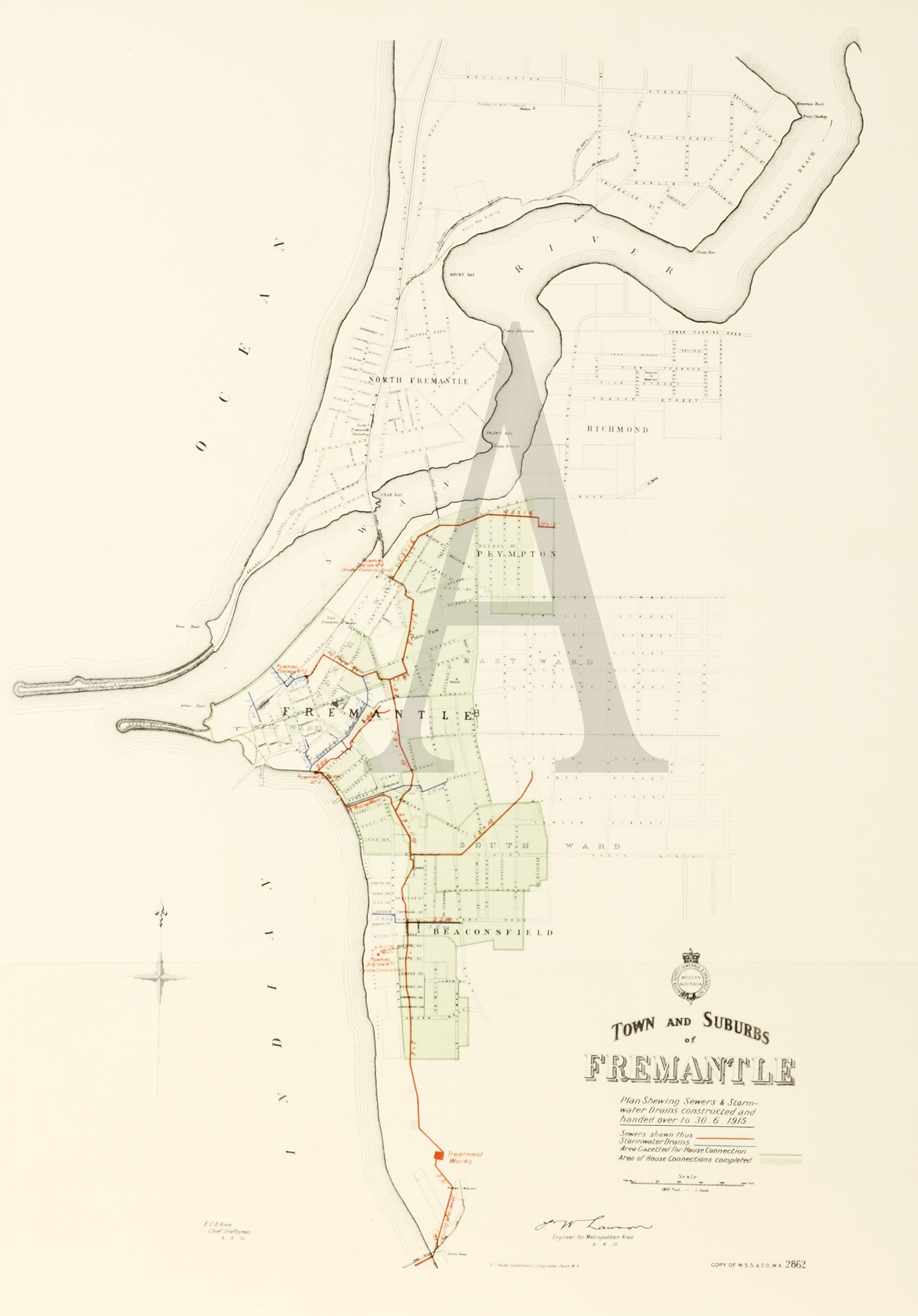 Rare large scale map of Fremantle and suburbs with colour key showing the extent of storm water drains and sewer connections. The department was headed by Harry Frederick Johnston (1853?) until June 1915 when Johnston was rushed to hospital after … Read Full Description