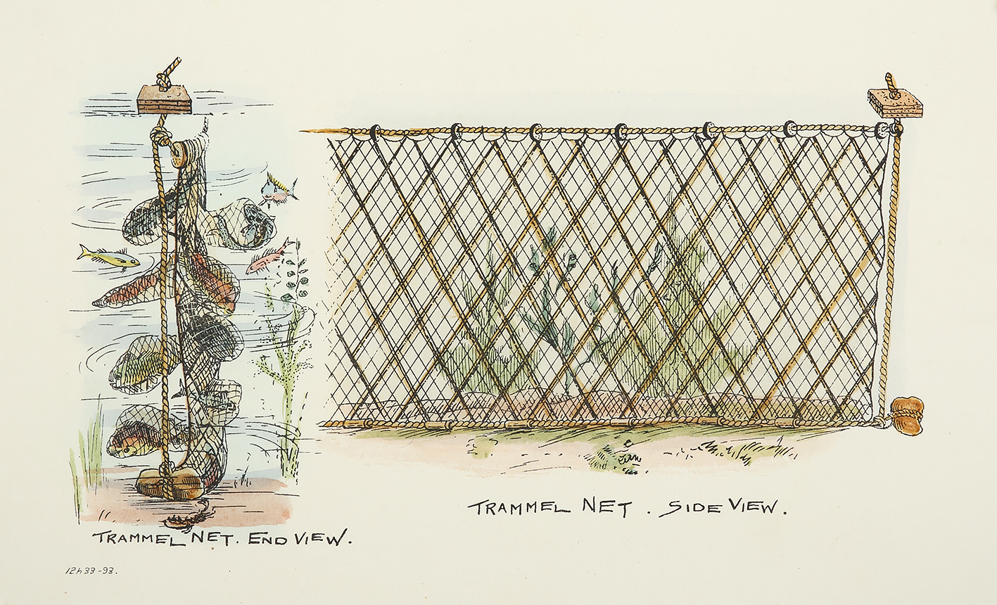 Trammel net. Side View. Trammel net. End View. - Antique Print from 1893