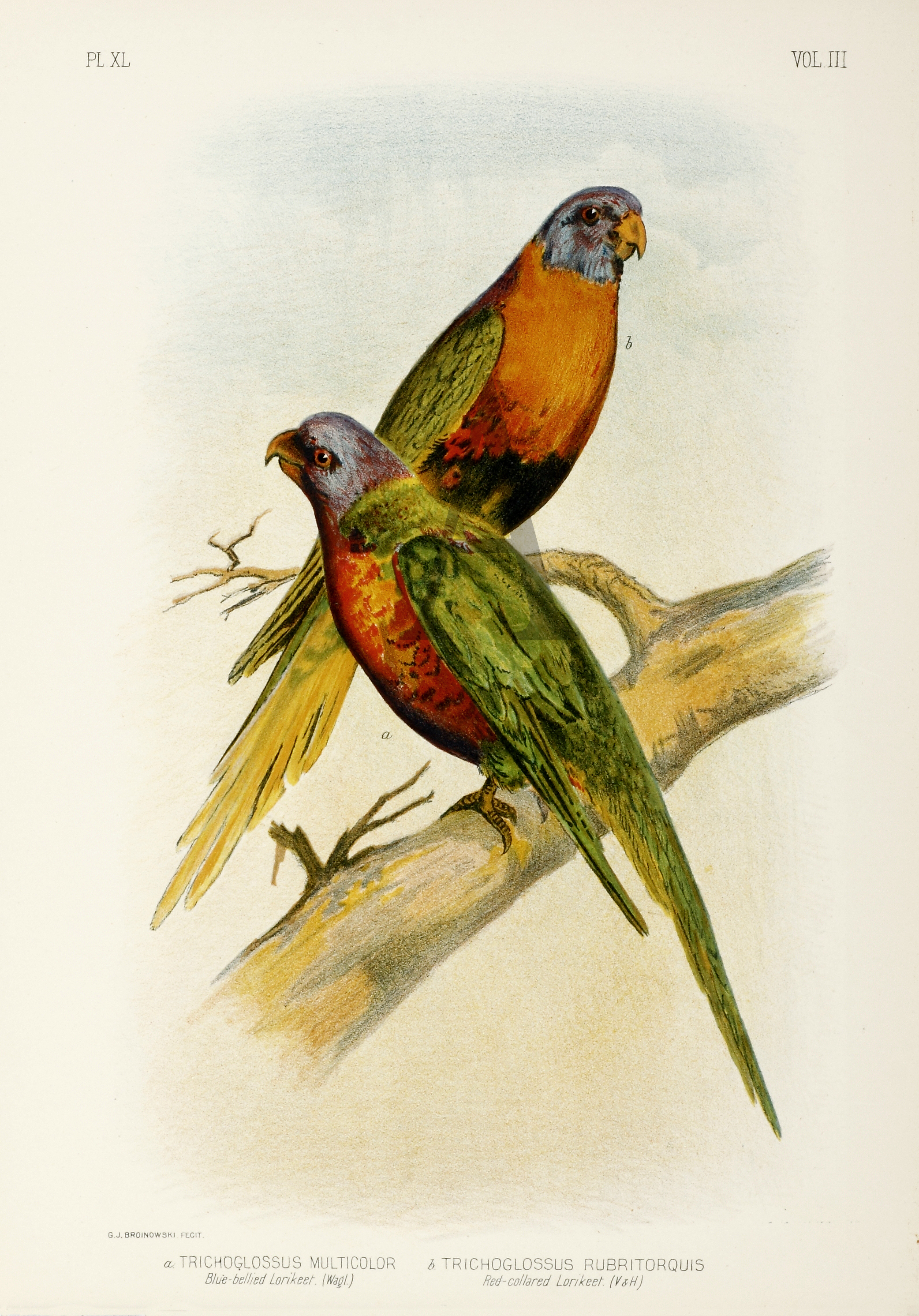 Lithograph of Rainbowand Red-collared Lorikeets from Broinowski’s, Birds of Australia,one of the three most important C19th studies of Australian ornithology.
