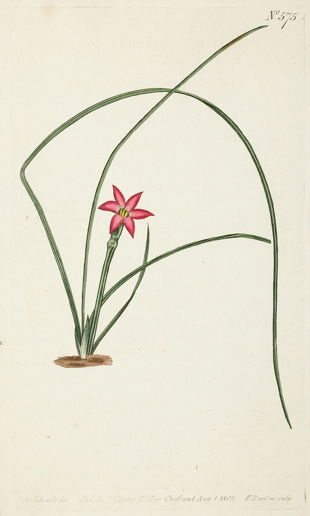 Fine original hand coloured botanical illustration of the Channel-leaved Trichonema, Onion Grass, from Curtis’s Botanical Magazine: or, Flower-Garden Displayed.