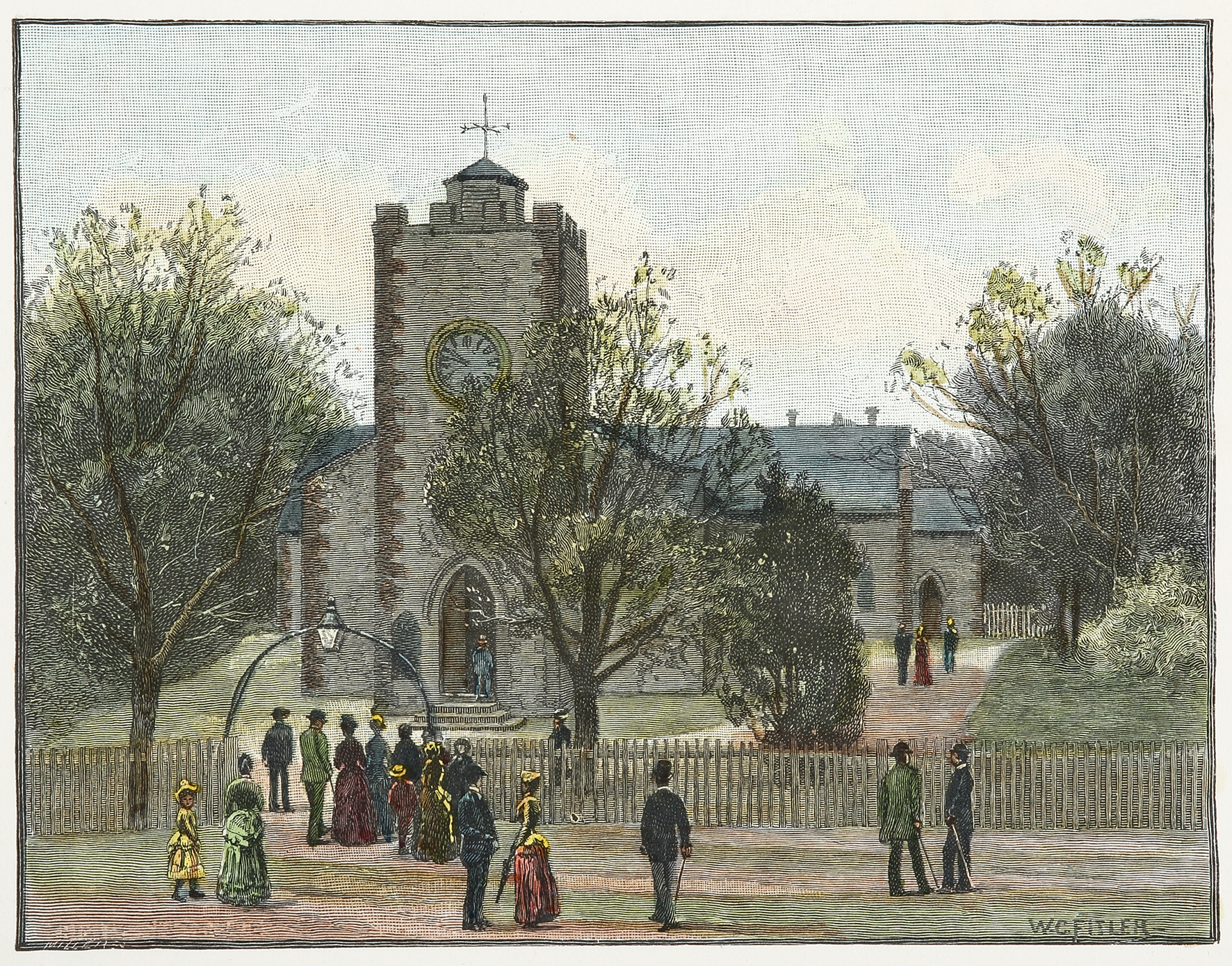 Scarce c.19th hand coloured engraving of Trinity Church, Adelaide.
