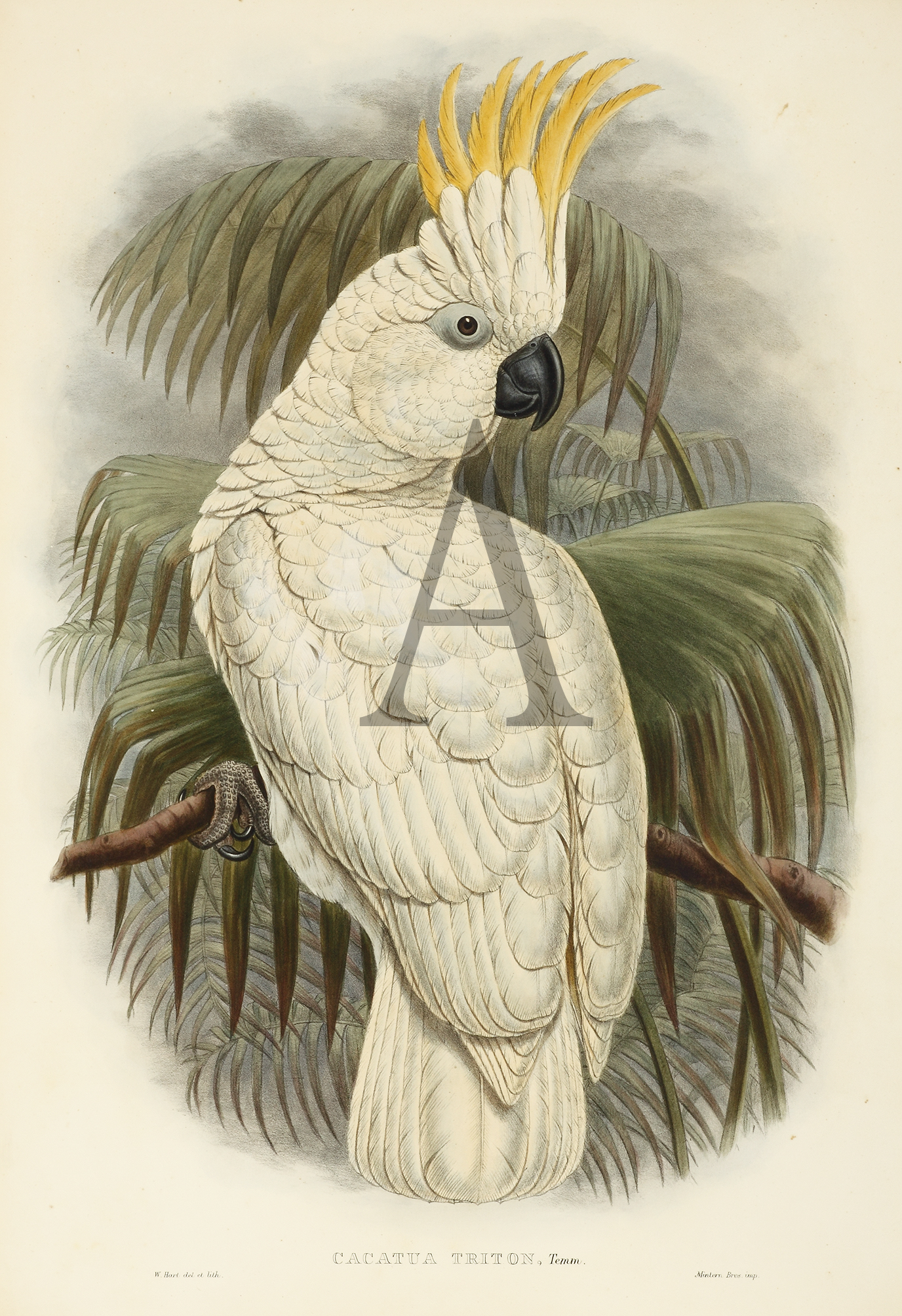 Common name : Triton Cockatoo (Sulphur-crested Cockatoo) Binomial name : Cacatua galerita triton Described : Temminck 1849 Found in New Guinea and adjacent islands. Sold with the original letterpress description as issued.