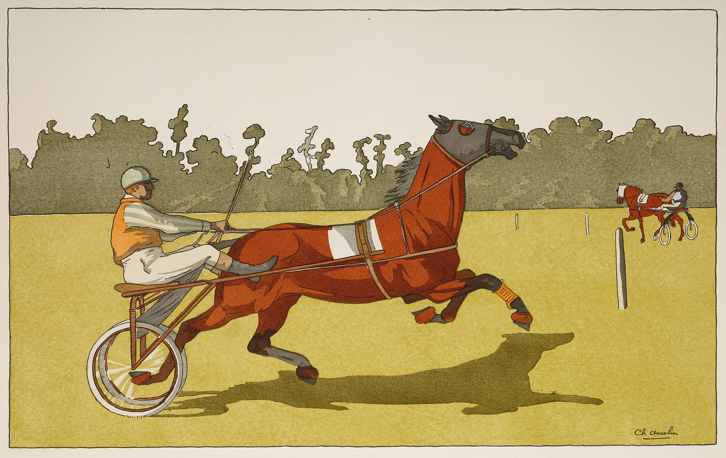 Superb French pochoir of harness racing, or trotting, with a driver in jockey silks on a two-wheel sulky. Issue by Galerie Lutetia, Paris.
