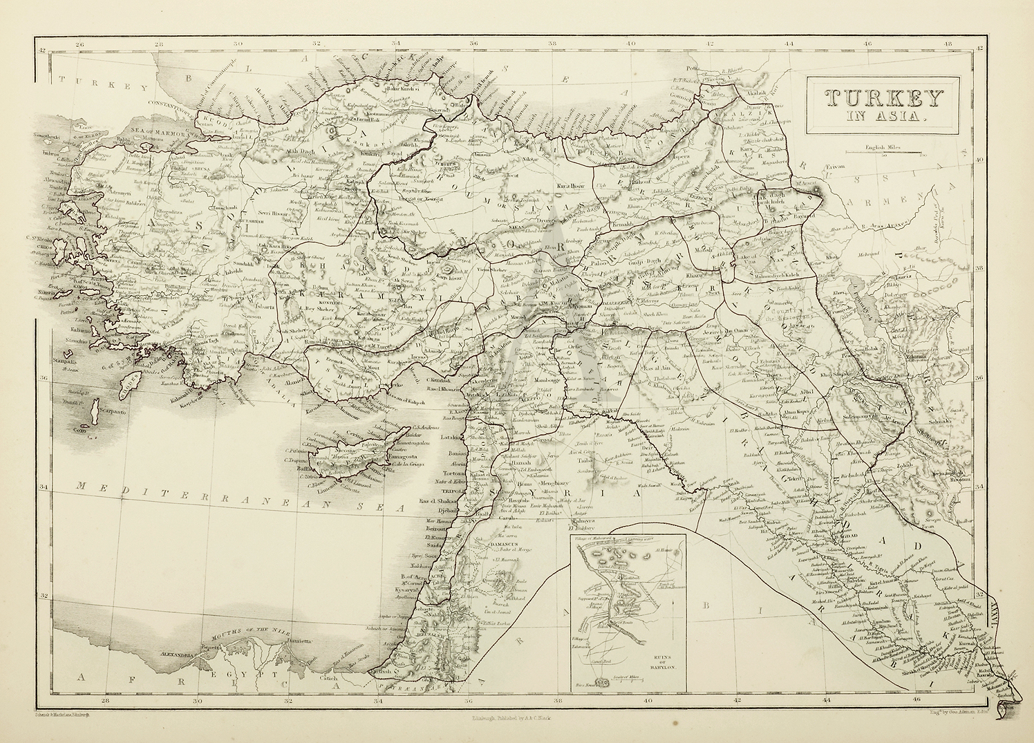 Detailed map extending from Greece, to the Holy Land and east to Iraq and Iran. From Black’s, General Atlas.