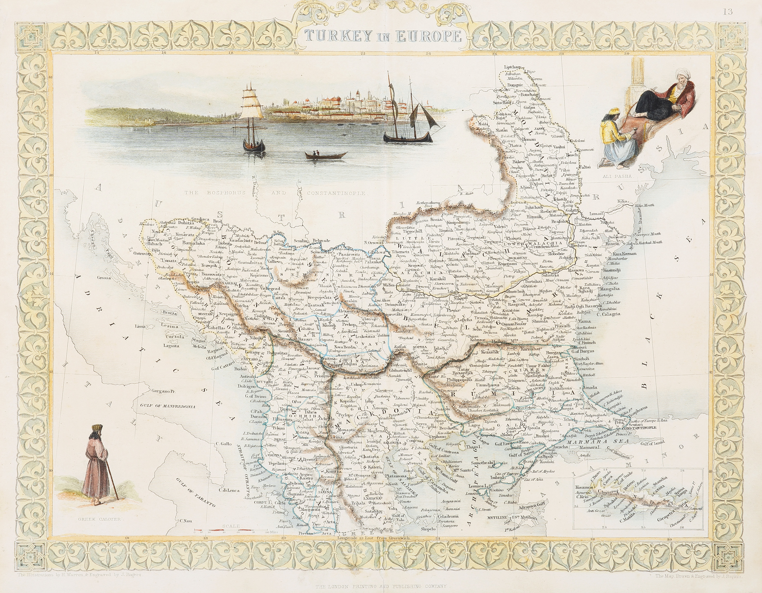 Scarce c.19th fully hand coloured example of Tallis’s map of the Ottoman Empire in Europe.