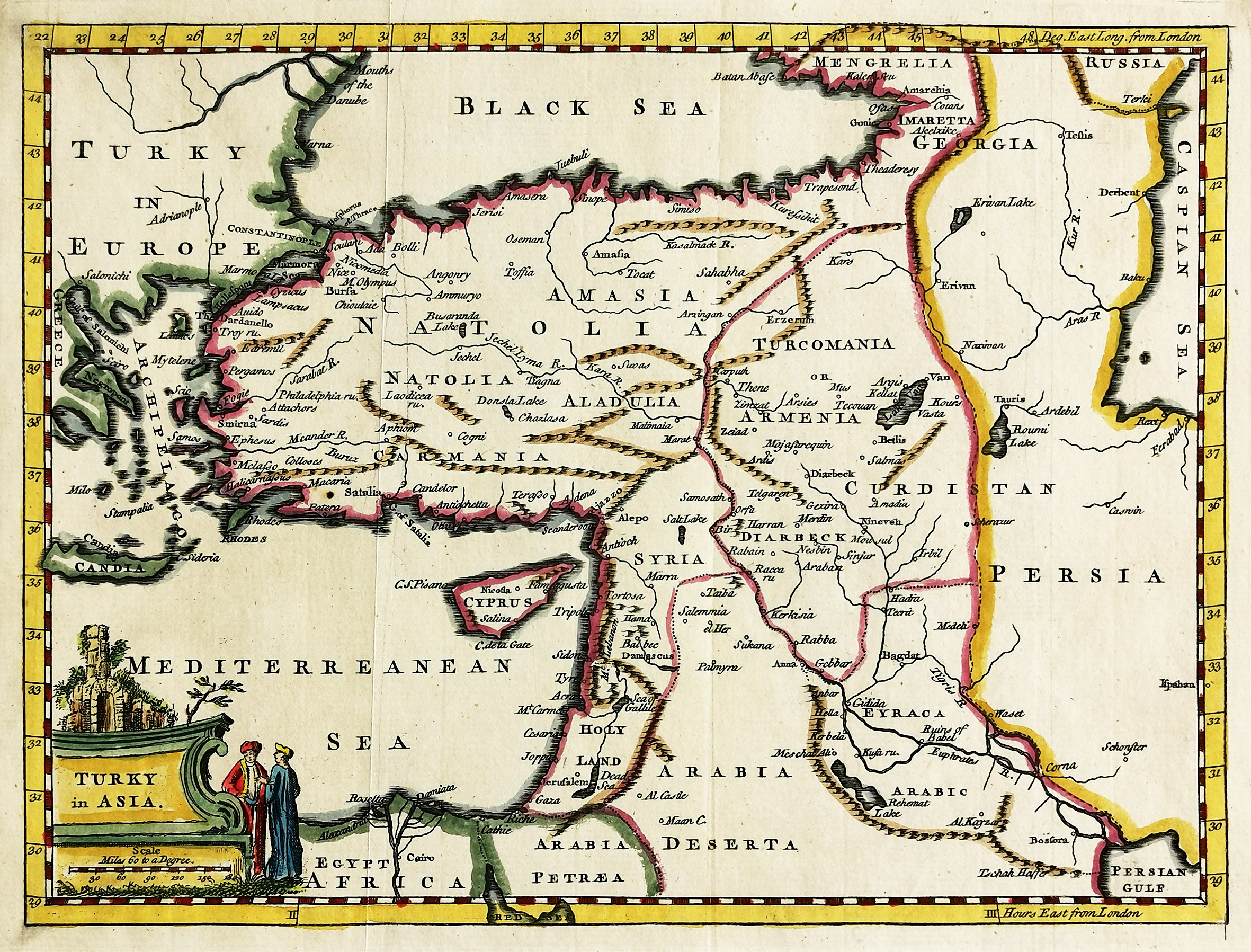 Small early map of the Turkish Empire with a decorative title cartouche comprising tow robed figuress From: Salmon’s A New Geographical and Historical Grammar.