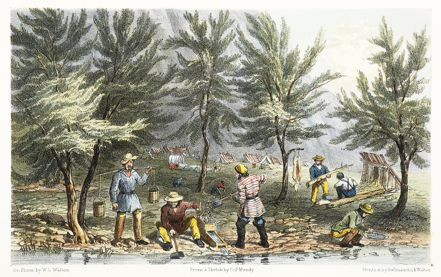 Early lithograph of the Turon River gold fields, New South Wales made two years after the first official gold discoveries near Bathurst, by Edward Hargreaves in 1851.