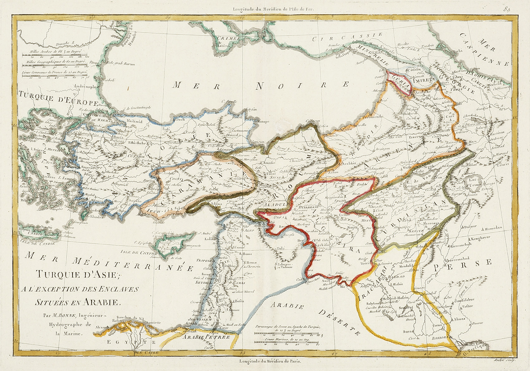 Bonne was an important French cartographer active in the later part of the C18th. In 1773 Bonne succeeded Jacques Nicolas Bellin as Royal Cartographer to France in the office of the Hydrographer at the Depôt de la Marine. Working in his official capacity, Bonne compiled some of the most detailed and accurate maps of the period. Bonne’s work represents an important step in the evolution of the cartographic ideology away from the decorative work of the 17th and early 18th century towards a more detail oriented and practical aesthetic.