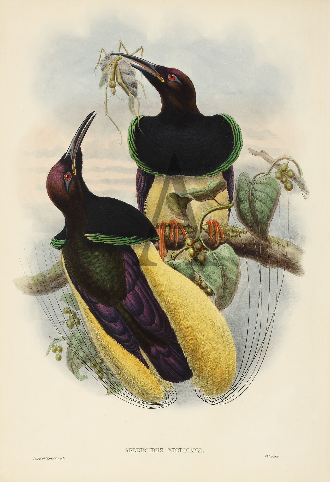 Gould was born in 1804, at Lyme Regis in Dorset. In 1818 his father was appointed a foreman gardener at the Royal Gardens, Windsor Castle. As a youth Gould also trained at these gardens and became an expert in taxidermy. In 1825 Gould moved to London and set himself up as a self-employed taxidermist. He was the first known taxidermist to have received royal patronage after preserving a Thick-kneed Bustard for King George IV. Numerous orders followed from the king with the most arduous task being stuffing the famous giraffe given by the Pasha of Egypt. He met and married Elizabeth Coxen in 1827. A talented artist in her own right, Elizabeth’s drawings and lithographic skills were fundamental to the success of John Gould’s renowned publications. In 1830, he obtained a number of specimens of the exotic and little-known birds of Northern India, forming the bold idea of issuing a book about them, which was rejected by the publishers. Gould was determined to issue the book himself at his own expense and so he arranged for his talented wife to draw and lithograph the plates form his own sketches. He persuaded N.A. Vigors to write the text for him and then set about getting subscribers for his publication. At this, he was spectacularly successful and this list was headed by Victoria (Queen from 1837) and Prince Albert, an emperor, a king, three princes and nine dukes. The resulting book, A Century of Birds… from the Himalaya Mountains, was published in 1832. This folio size (550mm x 380mm) was to become his format for all his great works. Encouraged by the response to his first book, Gould set about on a more ambitious project: an attempt to illustrate all of the birds of Europe. He engaged Edward Lear to share the job of illustrating the work with Elizabeth and between them they produced 449 plates for the Birds of Europe which was completed in 1837. This established Gould not only in the eyes of the public but also within the scientific community. He then sailed to Australia in May 1838 with his wife and eldest son, aged 7, a young nephew, a man-servant and a maid-servant, and his collector John Gilbert. He stayed in Australia for two years leaving from Sydney on 9 April 1840. On his return he took on his greatest work, The Birds of Australia begun in London on 1 December 1840. The final parts, making a total of thirty-six, appeared in 1848. They were bound in seven volumes and the cost to subscribers was £115. A supplement volume issued in parts was completed in 1869. The Birds of New Guinea and the Adjacent Papuan Islands, Gould’s last great work, was completed after his death by Richard Bowdler Sharpe. Gould prepared the first twelve of the 25 original parts of the work, while Sharpe, Gould’s protégé and devoted friend, was responsible for the remainder of the monograph. Sharpe was more than forty years junior to Gould, whom he had met when he was only fifteen, and they both shared a passionate interest in ornithology. In his last years, although an invalid and often in pain, Gould was always pleased when Sharpe visited him to look at his collection of skins and discuss the latest bird discoveries. No other ornithologist can claim to have discovered and illustrated faithfully so many species of birds. The Birds of New Guinea are a fitting tribute to a long and prolific life in the field or ornithology. They are a magnificent record of the exotic world that John Gould so dearly loved, not only for the scientific value but also for his love of nature.