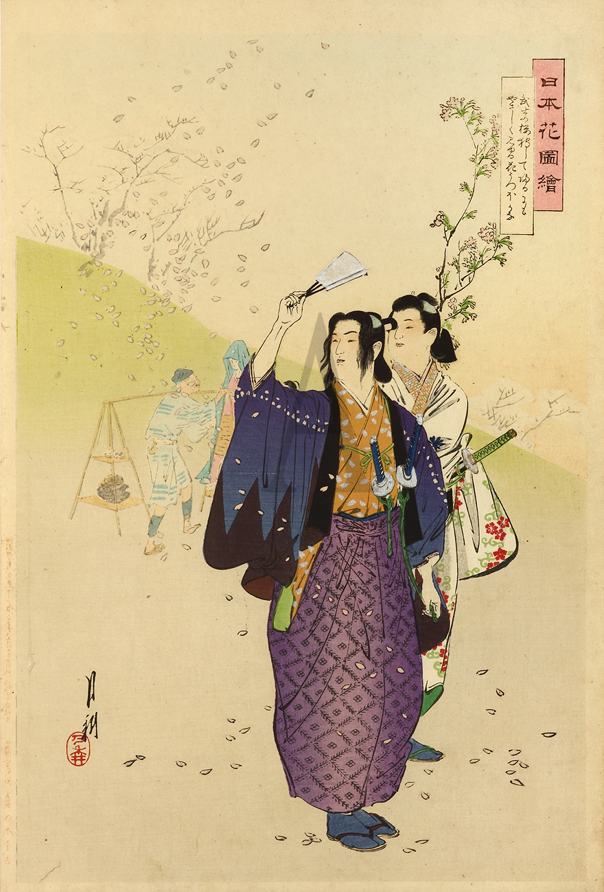 Two beautifully dressed Samurai enjoying the countryside festooned with falling cherry blossoms. Taken from the poem of "Samurai viewing cherry-blossom". From the series Nihon hana zue (Pictures of flowers of Japan )