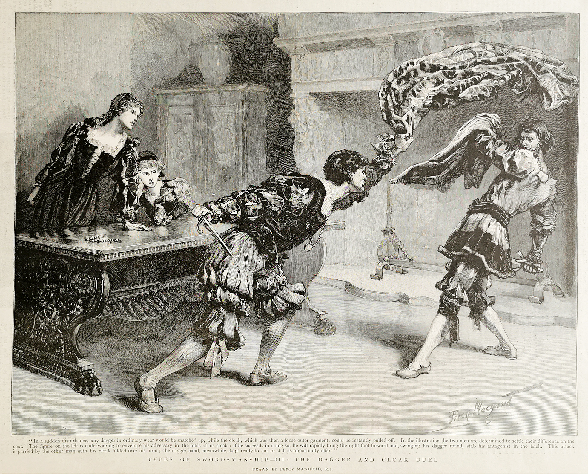 ” In a sudden disturbance, any dagger in ordinary wear would be snatched up, while was then a loose outer garment, could be instantly pulled off. In the illustration the two men are determined to settle their difference on the spot. The figure on the left is endeavouring to envelope his adversary in the folds of his cloak; if he succeeds  in doing so, he will rapidly bring the right foot foward and, swinging, his dagger round, stab his antagonist in the back. This attack is parried by other man with his cloak folded over his arm; the dagger hand, meanwhile, kept ready to cut or stab as opportunity offers.”