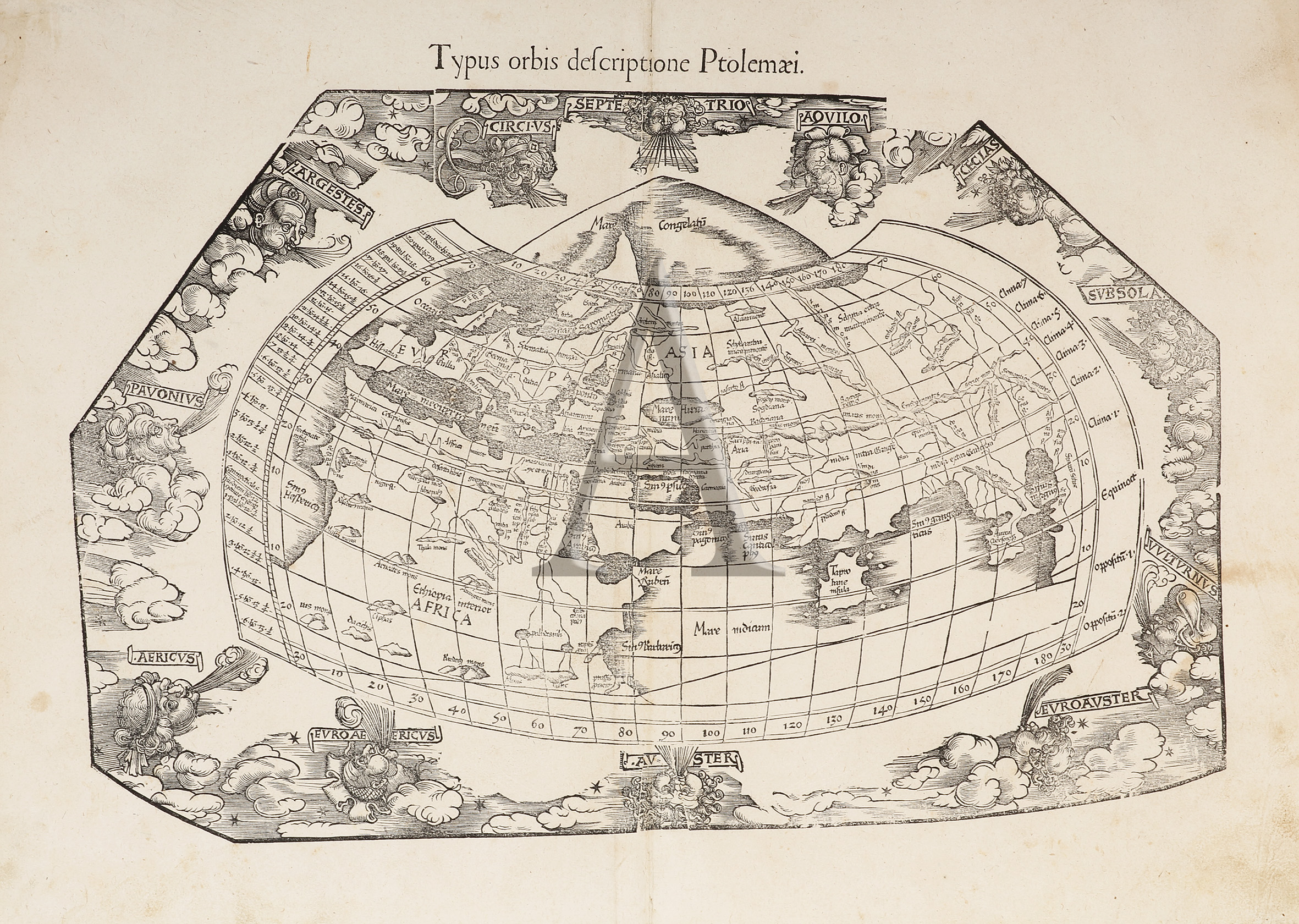 The map is on a conical projection with all regions above 65 degrees north covered by the inscription Mare Congelatum (Frozen Sea). The representation of the continents follows the Ptolemaic model of a landlocked Indian Ocean, except that the land mass that traditionally was shown connecting southern Africa with Asia, is not depicted. The map is surrounded by twelve classical wind-heads blowing from each direction.