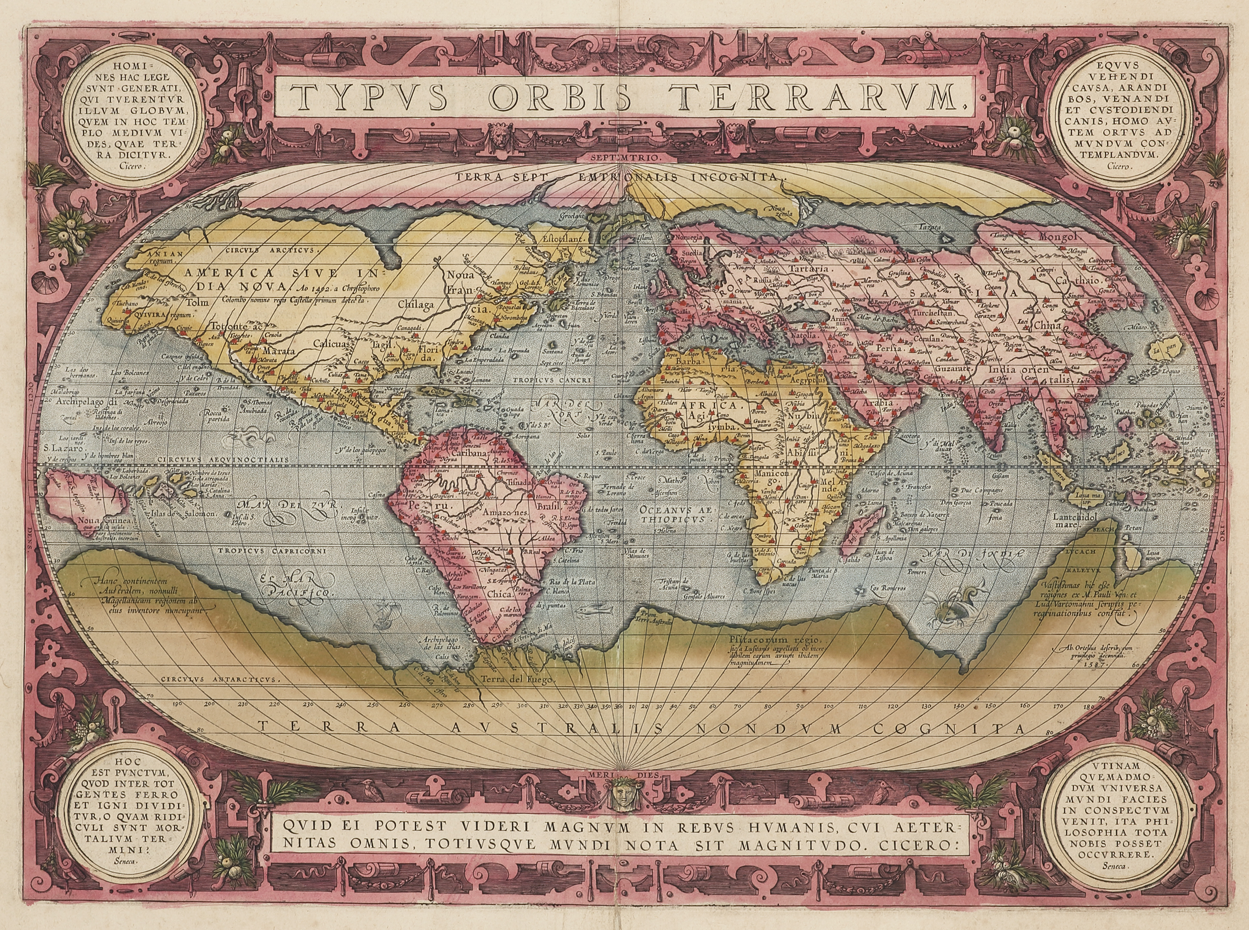 Four medallions decorate each corner and feature quotes by the classical Roman statesmen Cicero and Seneca. The border of clouds, included on Ortelius’s earlier world map, has been replaced by a more intricate and elegant lattice of strapwork and swag. Beach, the northern tip of Terra Australis is shown and above it the land of Java Major (Java), both named by Marco Polo. Many of the new place names appearing along the North American west coast were provided to Ortelius by Richard Hakluyt on the basis of recent explorations. A bulge in South America which appeared on his previous world map, has now been corrected and the Solomon Islands are marked for the first time.
