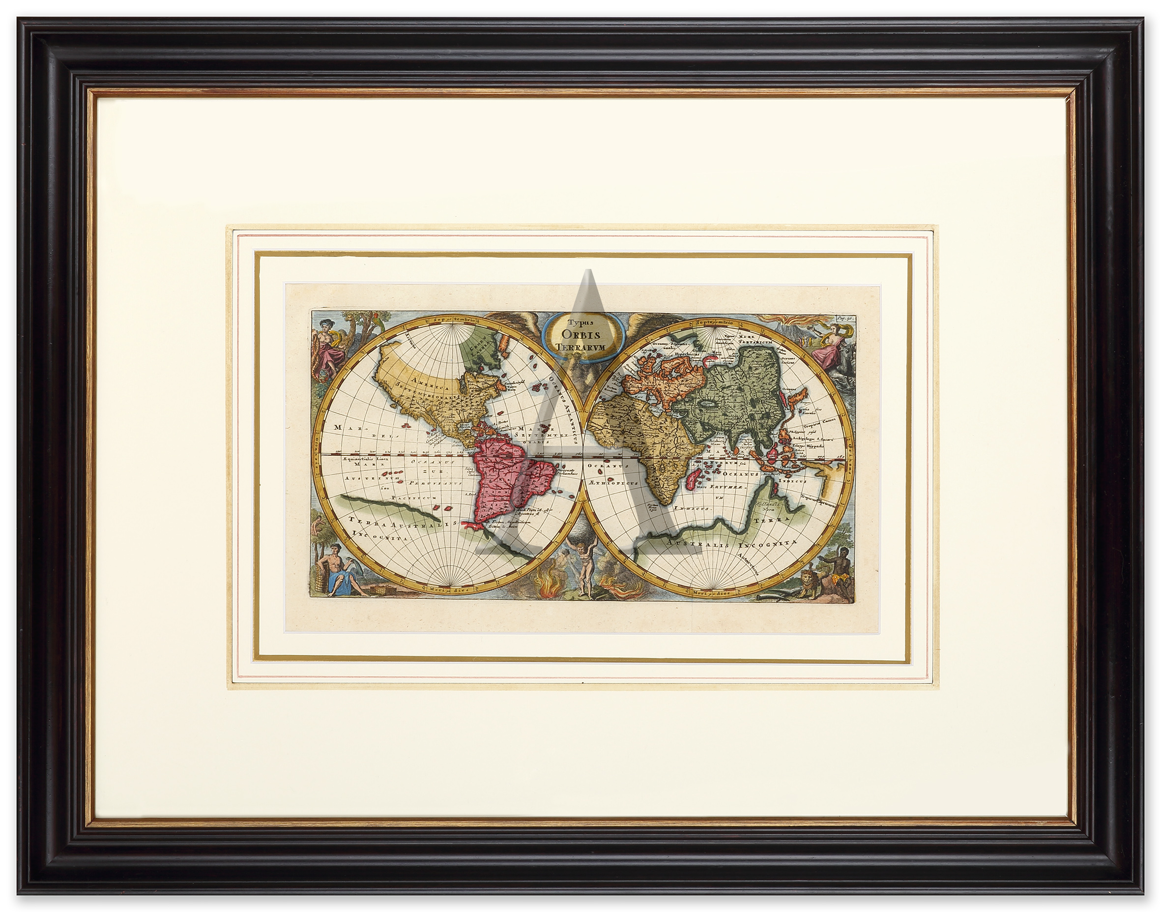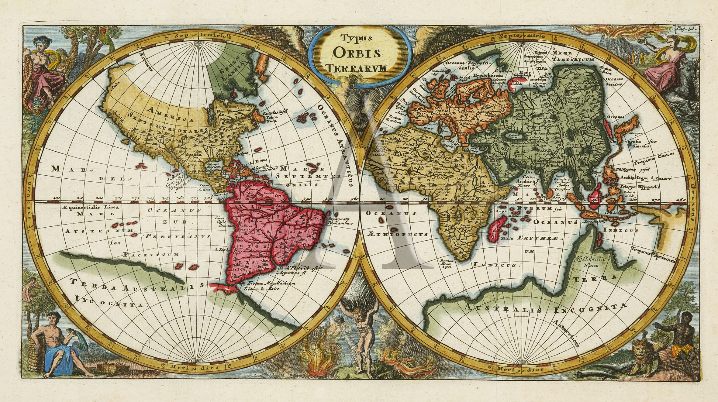 Superb and rare miniature double-hemisphere world map decorated with the four continents shown in allegorical form, with examples of their animal life and inhabitants. Australia is named Jollandia Nova and the Great Southern Land is named Terra Australis Incognita. This Cluver’s most elaborate miniature world map, the others do not contain the decorative embellishments surrounding the spheres.