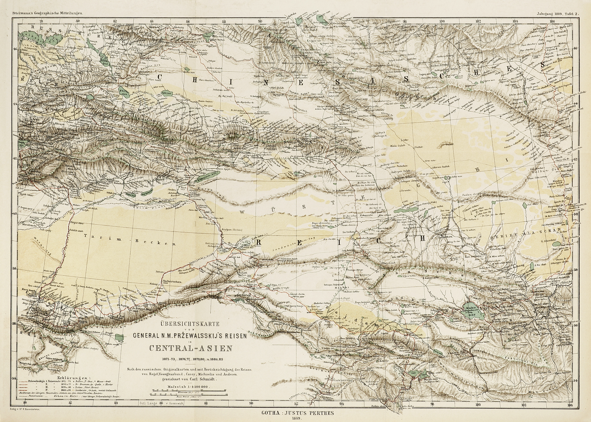 Ubersichtskarte von General N.M. Prezewalsskkij’s Reisen in Central-Asien 1871-73, 1876, 77,-1879, 80,-u.1884, 85.
