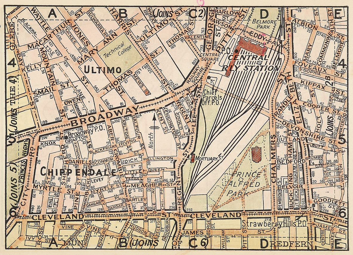 Scarce, miniature c.20th hand coloured lithographed map of Ultimo and Chippendale. Collections:National Library Australia: Bib ID: 3093305 State Library New South Wales: Call Numbers Q912.9441/1 , 94/211