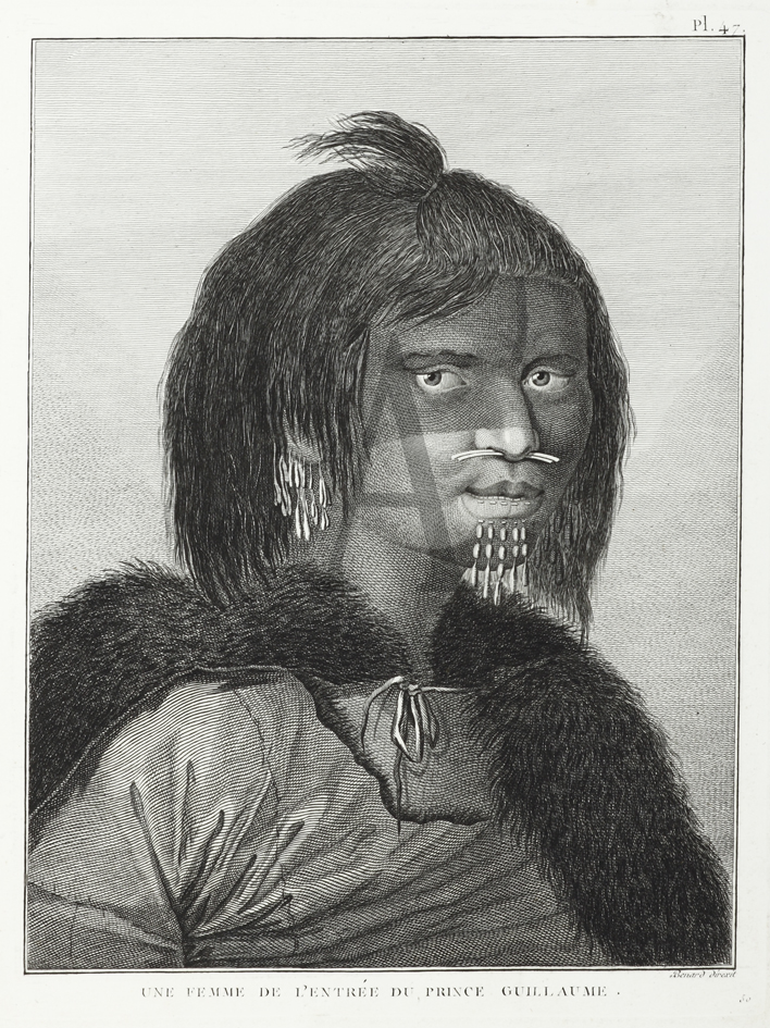 Rare engraving of a woman of Prince William’s Sound, Alaska. From the French edition of Cook’s voyages.