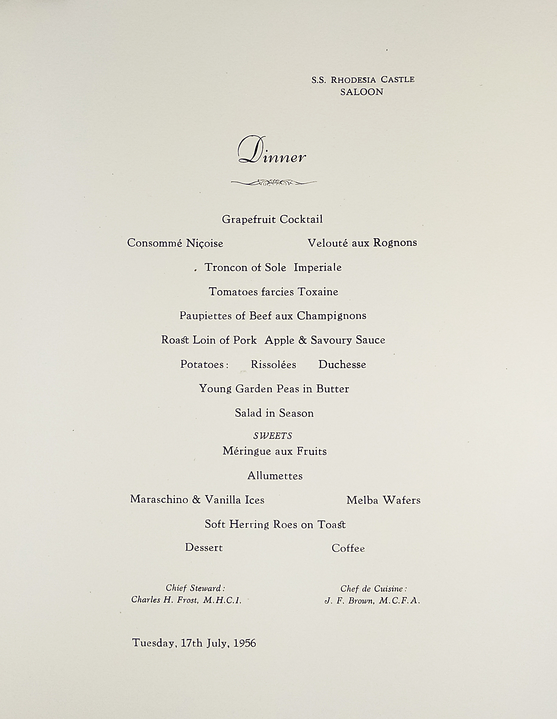 Dinner menu for the Union-Castle Line dated Tuesday 17th July, 1956, thick card 4pp. with front cover of a Cape Bushbuck. The Union-Castle Line was a British shipping line that operated a fleet of passenger liners and cargo ships between … Read Full Description