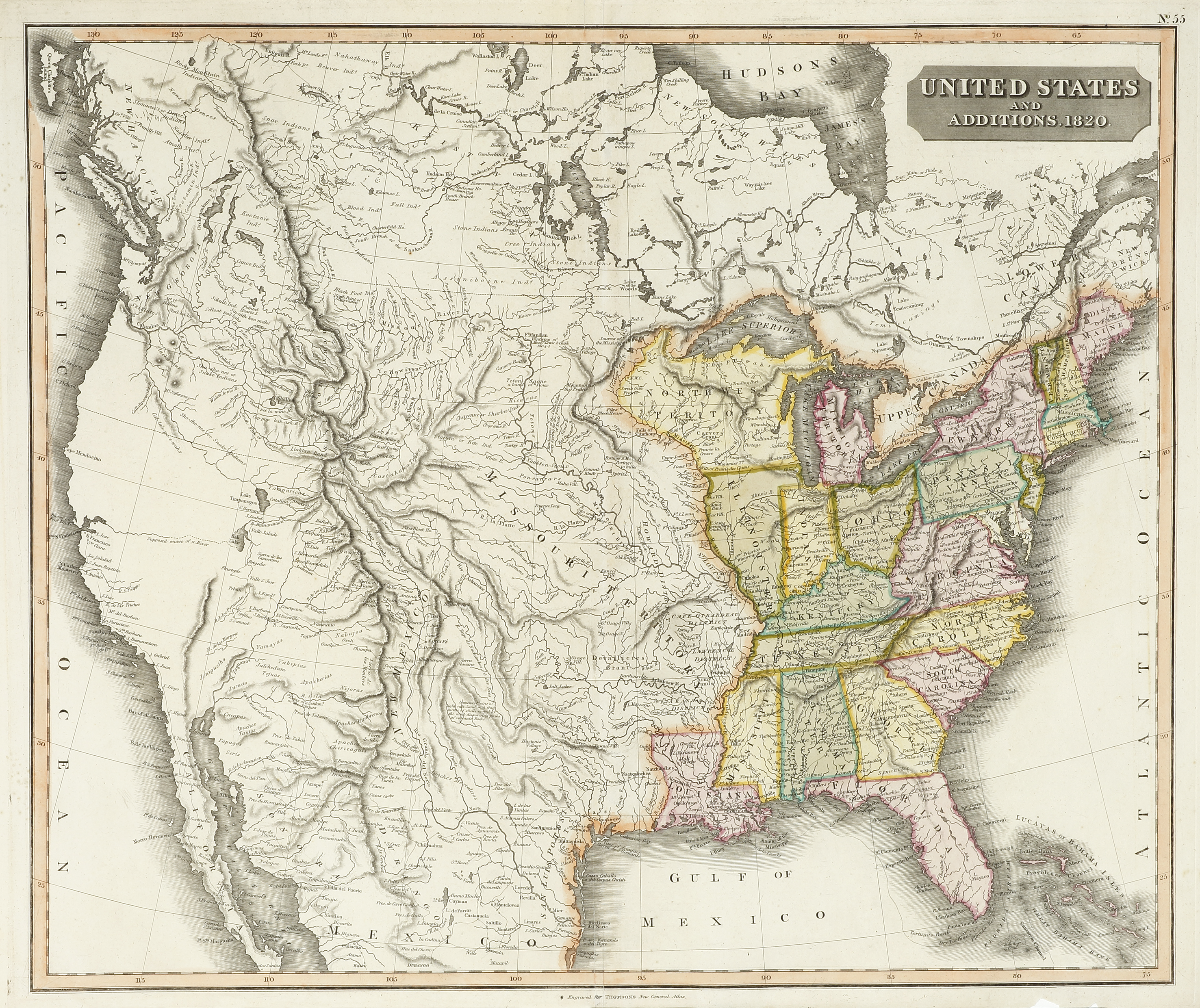 Rare large scale of the United States published in 1820 showing the extent of inland knowledge up to and including the expeditions of Lewis and Clark. The states up to the ‘Missouri Territories’ are shown.