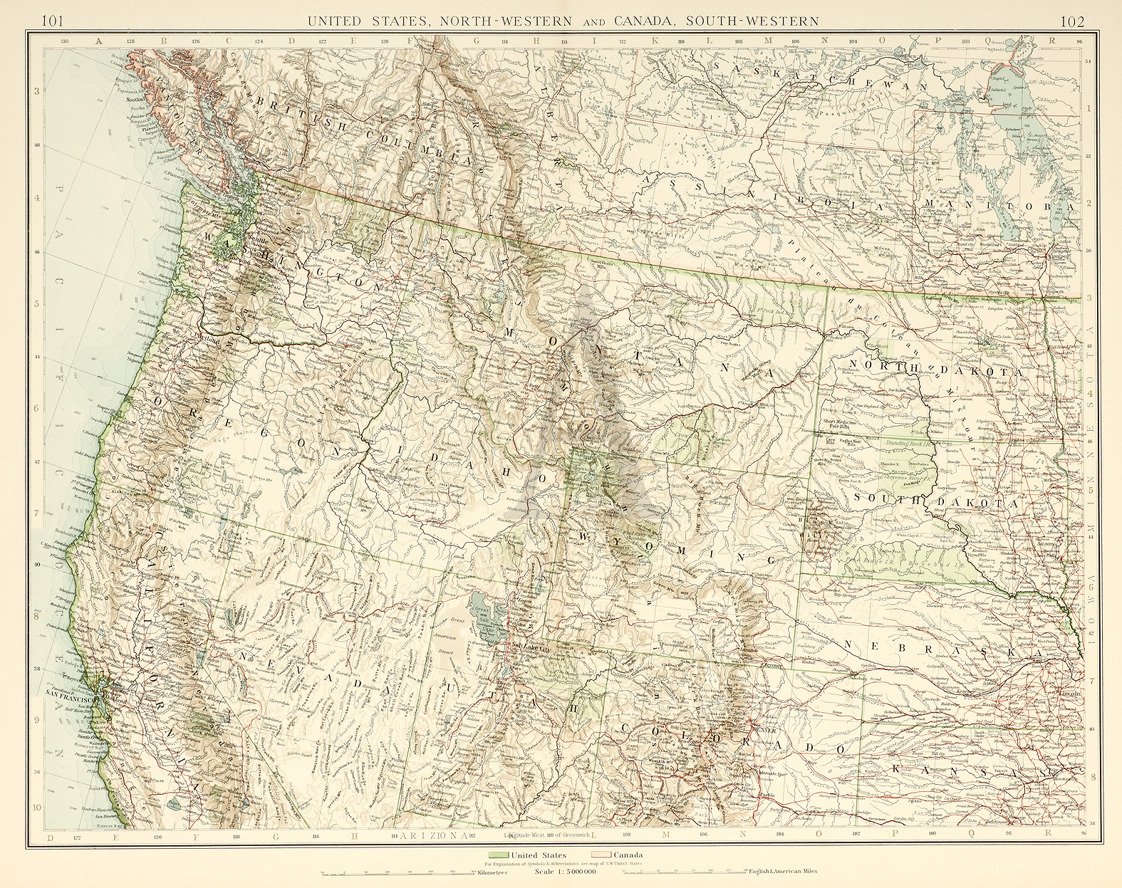 Very detailed c.19th map of north west Americas. From: The Times Atlas which was the English issue of Richard Andree’s, Allgemiener Handatlas’ one of the most comprehensive world atlases for its time.