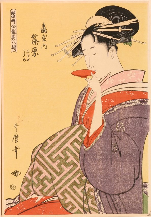 Extensive embossing to the kimino. Utamaro Kitagawa 1750-1806 Utamaro Kitagawa is highly appreciated as the dominating ukiyo-e artist of the late eighteenth century. Yet little is known about his life. Neither the precise date of Utamaro’s birth or his birthplace. It is generally agreed that he started his career as a pupil of the painter Toriyama Sekien. His early known works are actor portraits and theater programs, published under the name of Utagawa Toyoaki. In 1781/82 he changed his name to Kitagawa Utamaro.