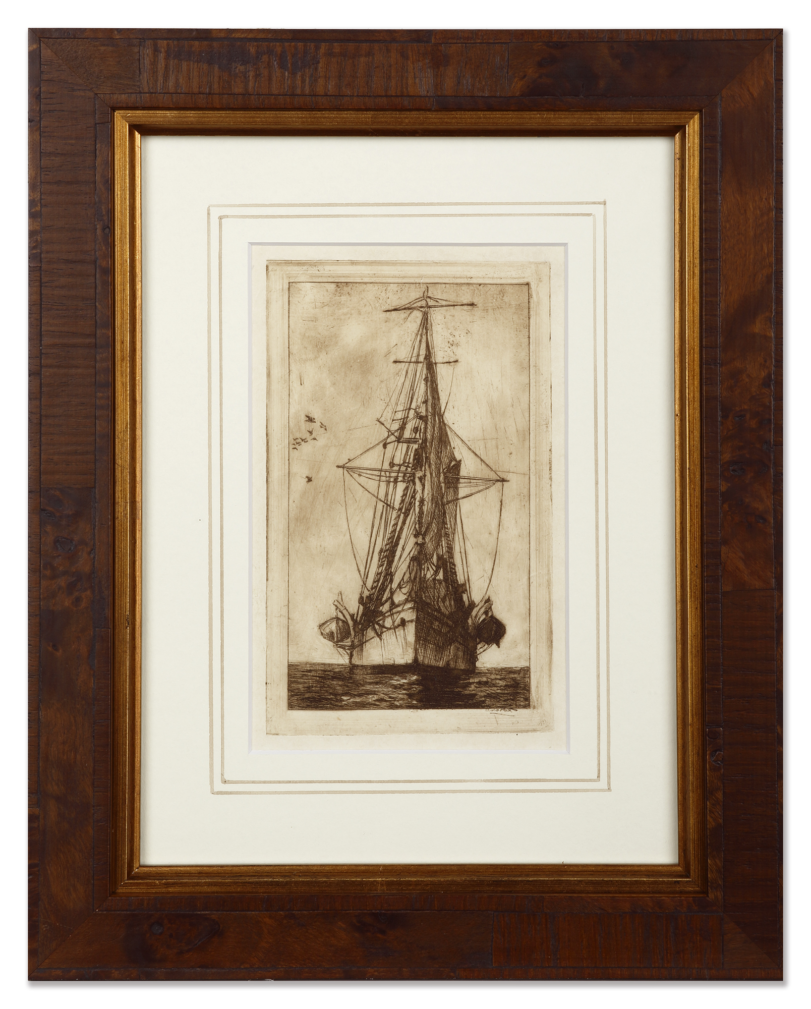 Early C20th etching of an early sailing ship.