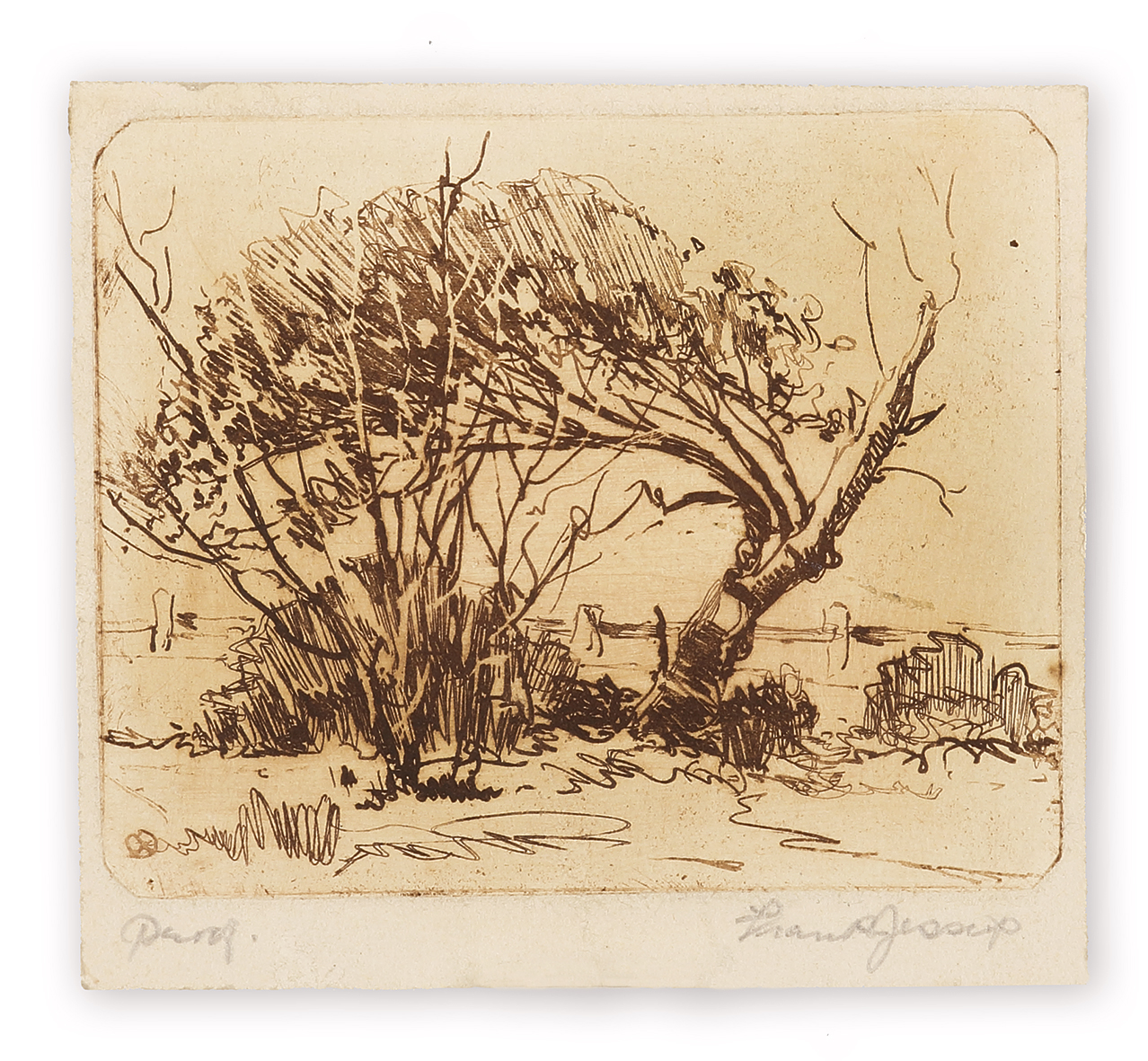 Small untitled etching of trees by Frank Jessup.