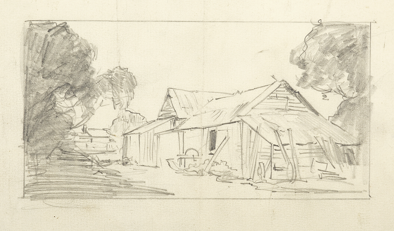 Fine unsigned pencil drawing of a barn by the artist and master print maker John Barclay Godson. Probably a preparatory drawing for an etching.